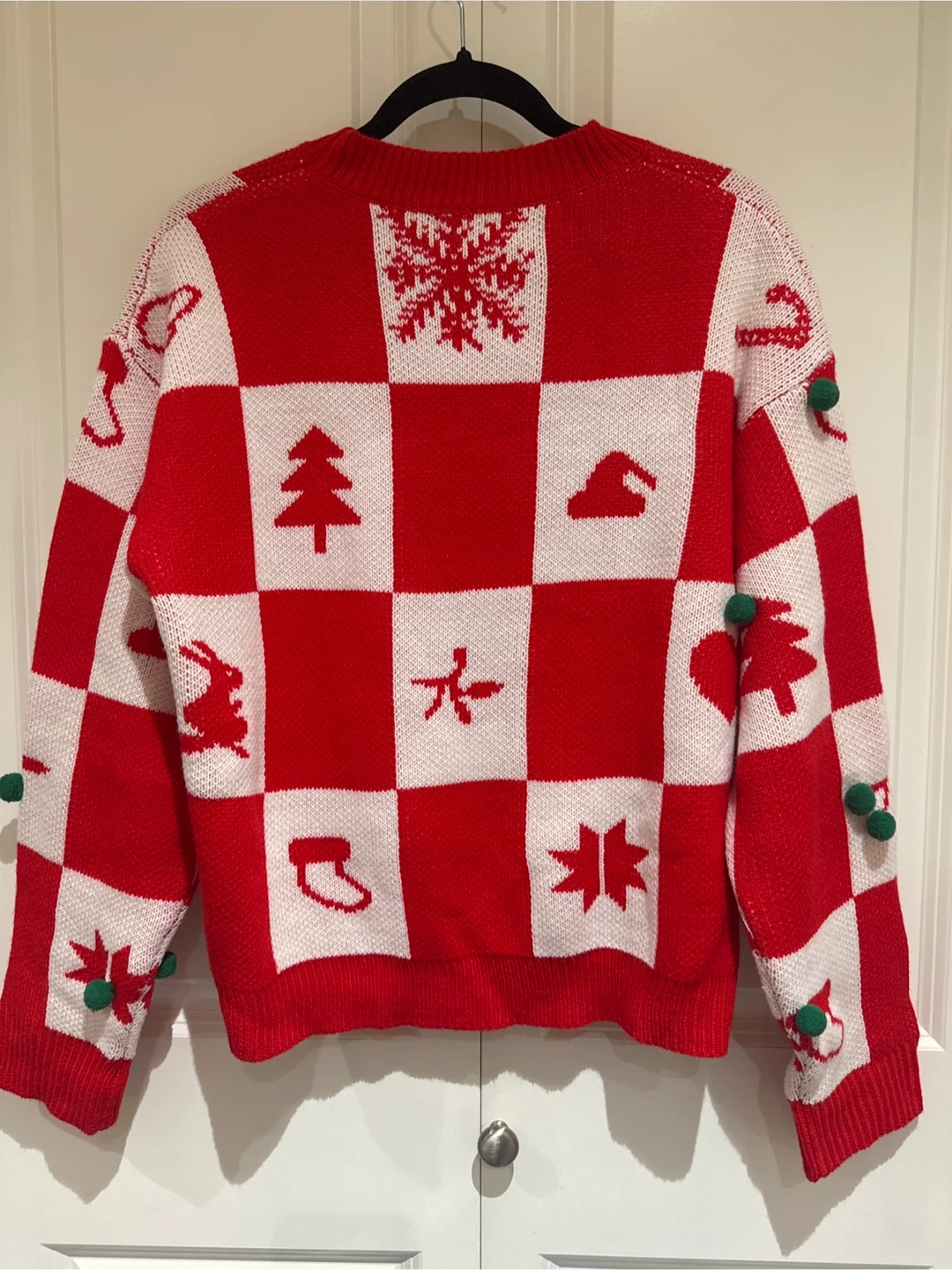 Festive red and white Christmas sweater with a checkered pattern. Features classic holiday symbols like Christmas trees, snowflakes, and Santa hats. Perfect for adding some cheer to your wardrobe this holiday season!