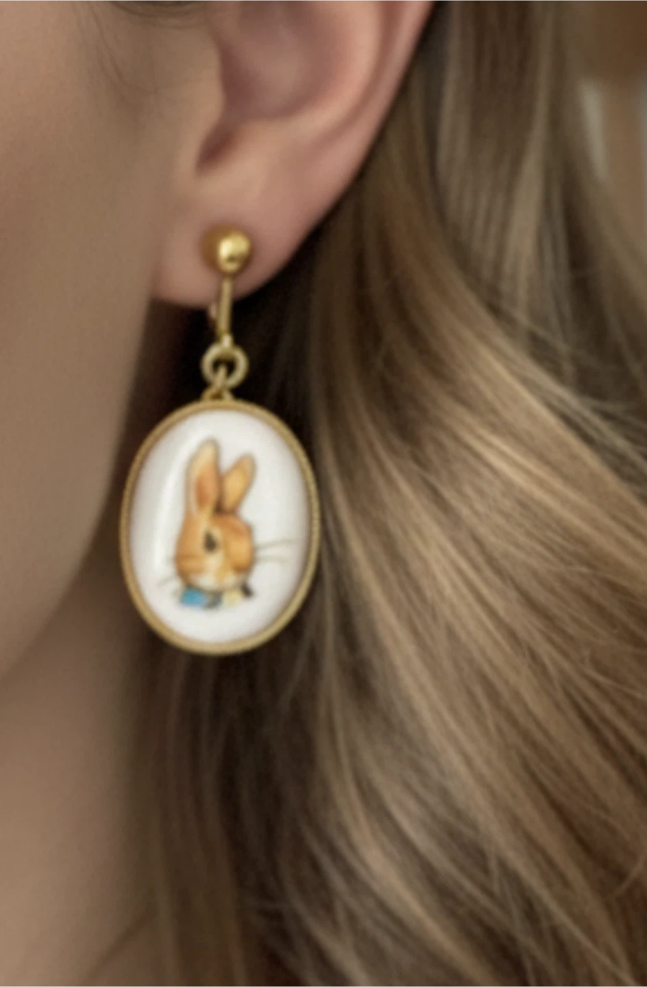 Selling a pair of vintage clip-on earrings. They feature a cute rabbit design on an oval white background with a gold-tone border. These earrings have a classic, timeless look!