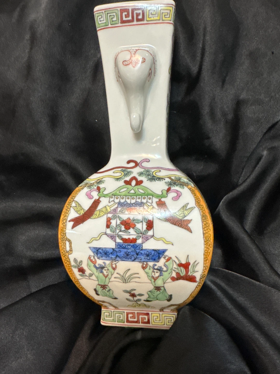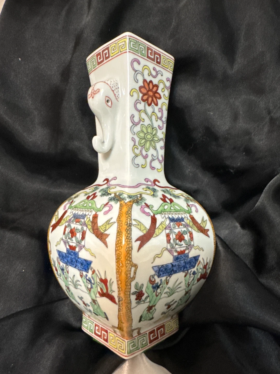Selling a vintage vase that appears to be in the style of the Ming Dynasty! It features colourful floral and geometric patterns, with elephant-shaped handles. The bottom has Chinese characters, adding to its unique charm