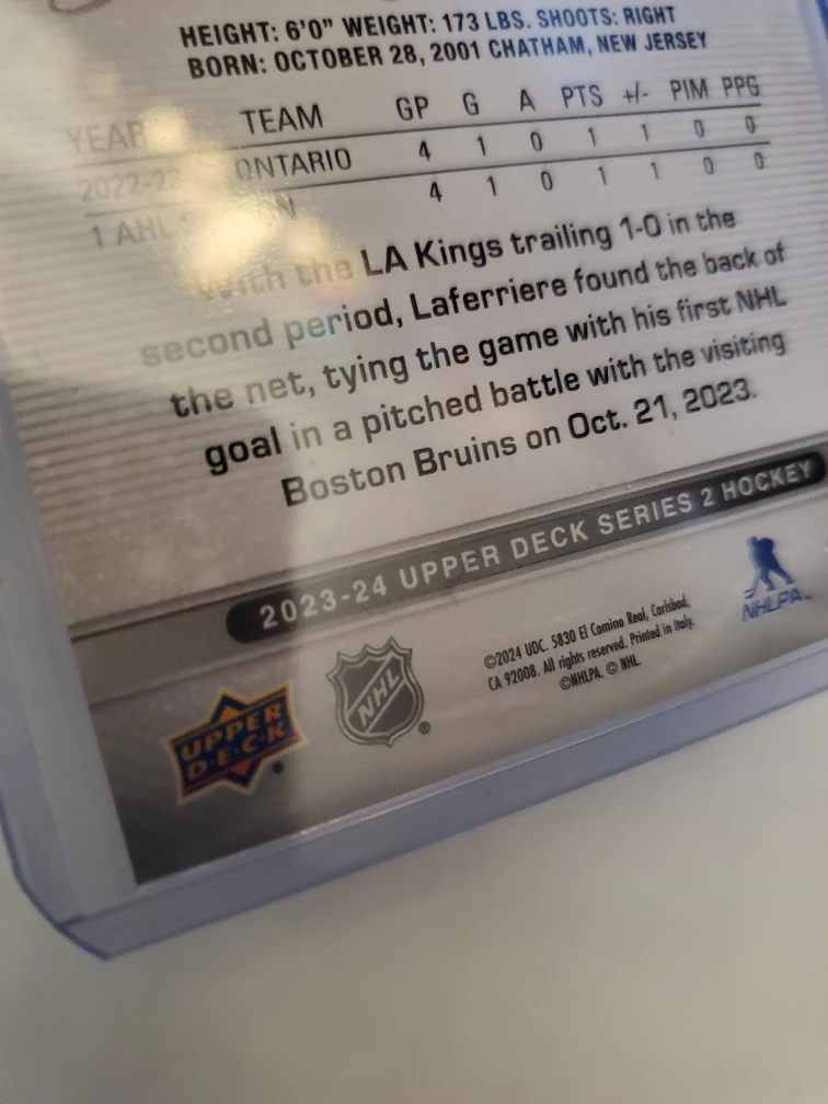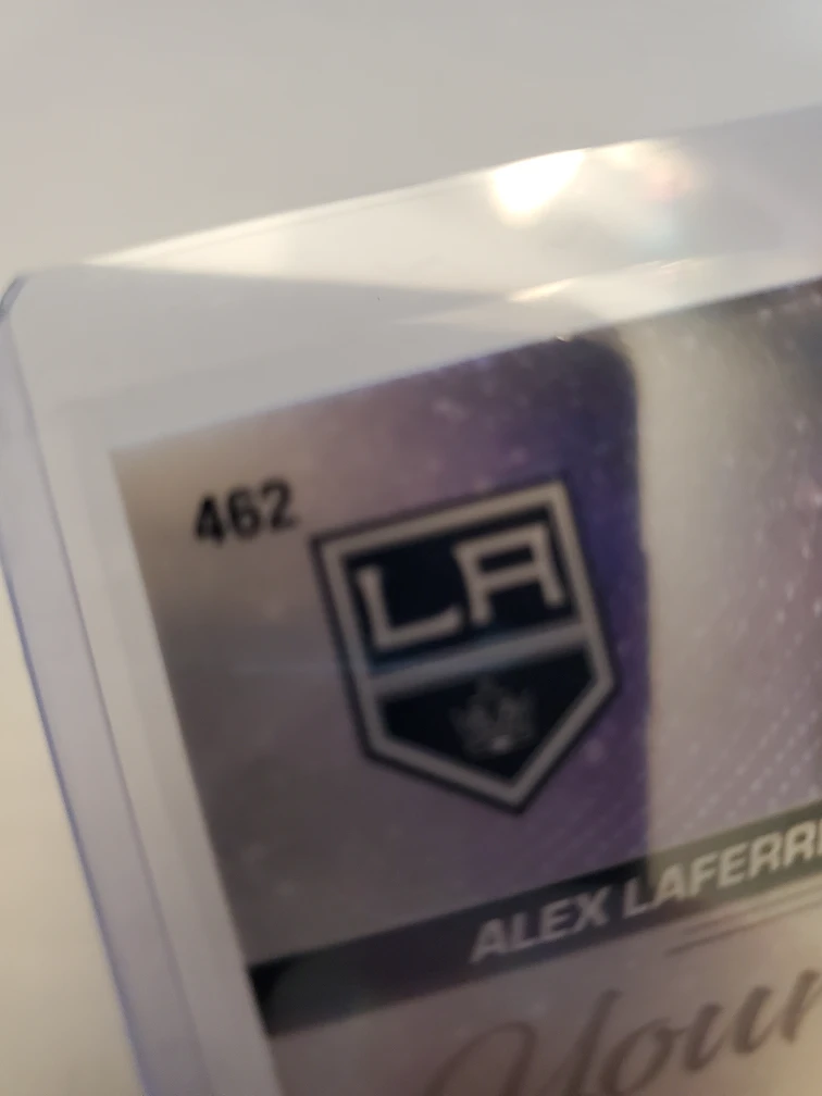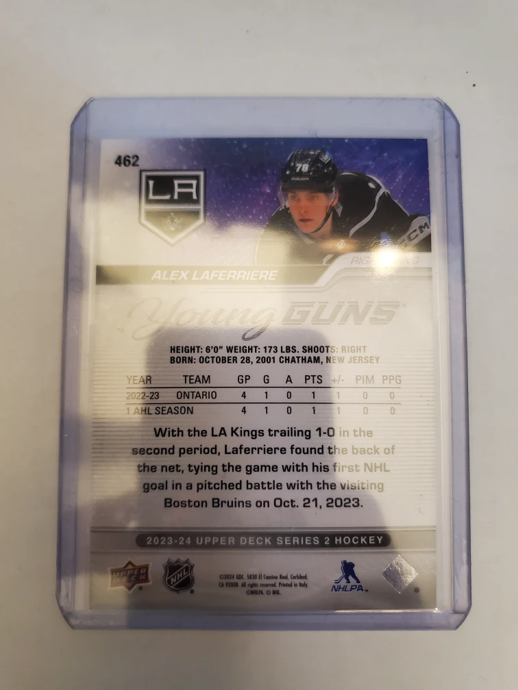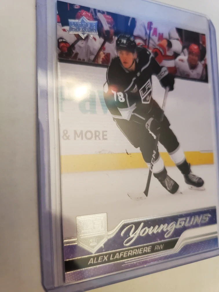 Great condition Alex Laferriere young guns rookie card. This card was placed in a penny sleeve and plastic top loader after pulling it from a pack.