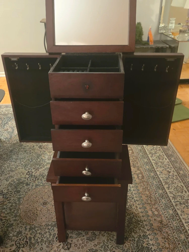 Selling a lovely dark wood jewelry armoire! It features a mirror on top and several drawers for storing all your precious items. Perfect for keeping your jewelry organized and safe. It has doors that open on either side with hooks for hanging necklaces.