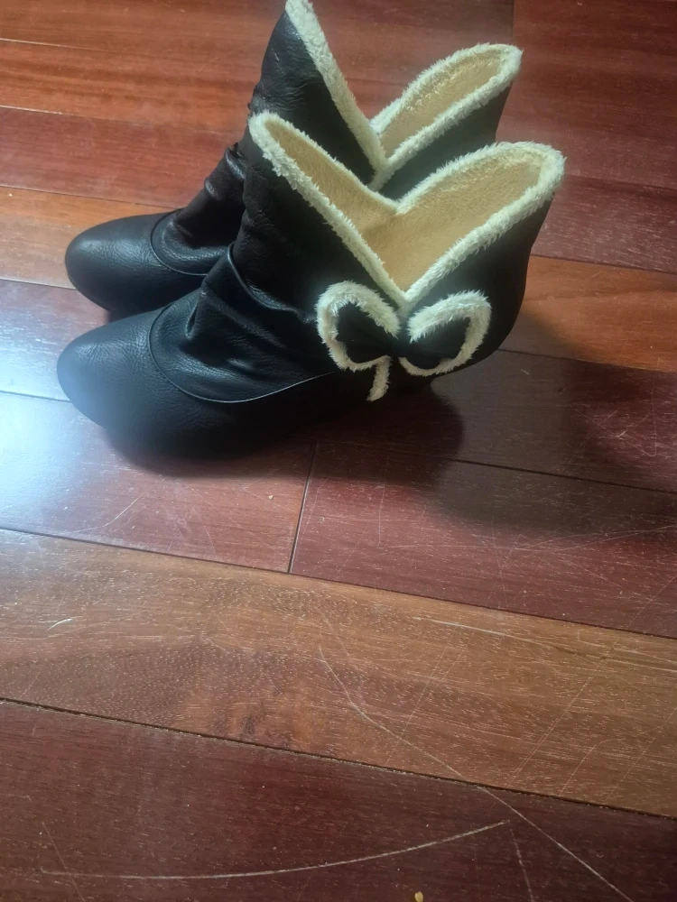 Cute black ankle boots with a sweet bow detail! They have a soft lining, perfect for keeping your feet cozy. These boots are in brand new and ready for a new home. They would look great with any outfit!