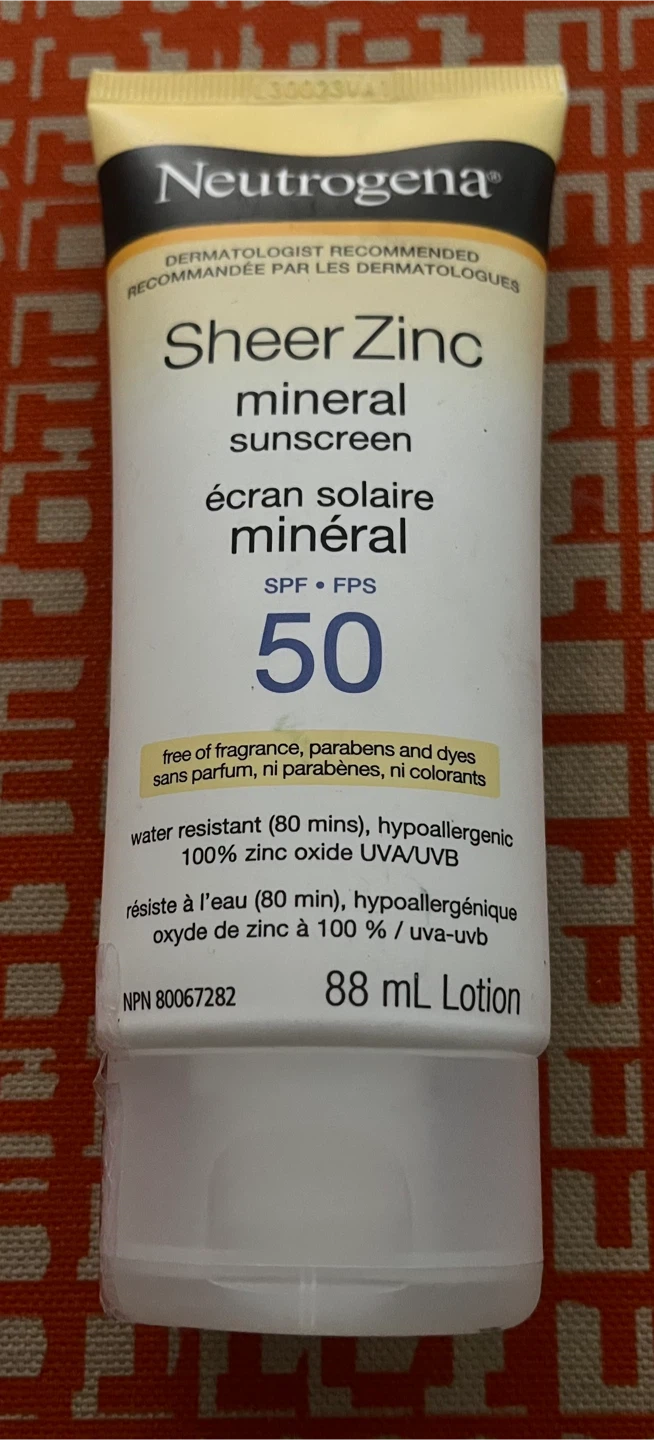 Selling a bottle of Neutrogena Sheer Zinc mineral sunscreen with SPF 50. It's free of fragrance, parabens, and dyes, and water resistant for up to 80 minutes. This sunscreen is hypoallergenic and provides 100% zinc oxide UVA/UVB protection. The bottle contains 88ml of lotion