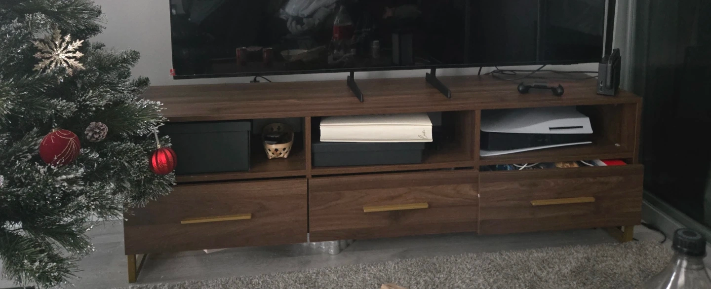 Walnut brown TV stand with gold accents, featuring a modern and warm design.