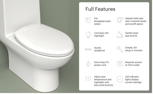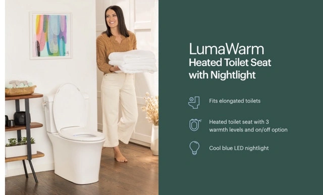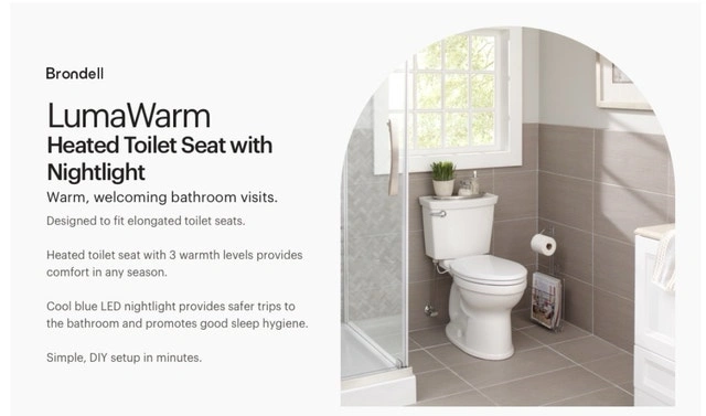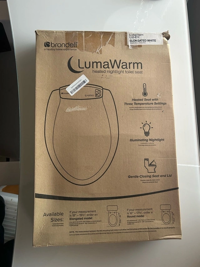 Brand New in Box! Brondell L60-EW LumaWarm Heated Nightlight Elongated Toilet Seat, White. Experience comfort with this Brondell L60-EW LumaWarm heated toilet seat, designed to fit elongated toilets and featuring a cool blue LED nightlight. This seat offers adjustable temperature settings, a gentle-close seat and lid, and easy DIY installation. Key features include: