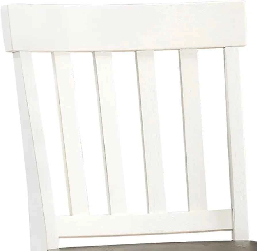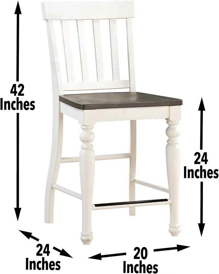 MDF/Rubberwood/Mango Wood/Acacia Veneer. Two-tone ivory and dark oak finish. Schoolhouse style. Scooped wood seat for comfort. Footrail with metal kick plate. Number F60
