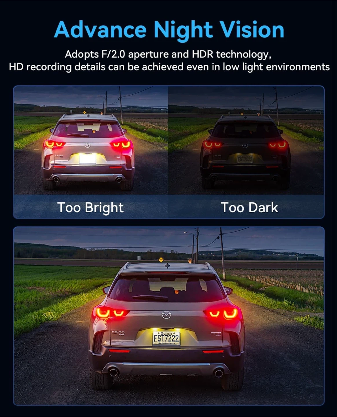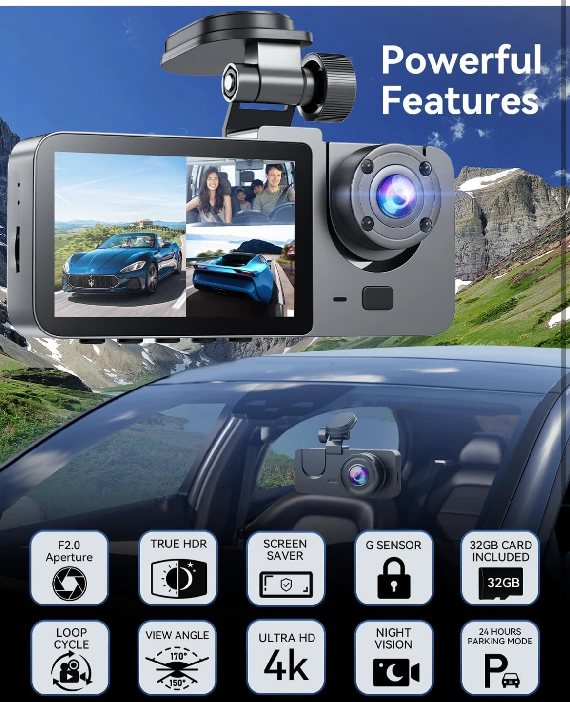 Dash Cam Front and Rear Camera for Car, 4K Full HD Dash Camera Inside 3 Channel, Night Vision, Loop Recording, G-Sensor, 170°Wide Angle, 24 Hours Recording