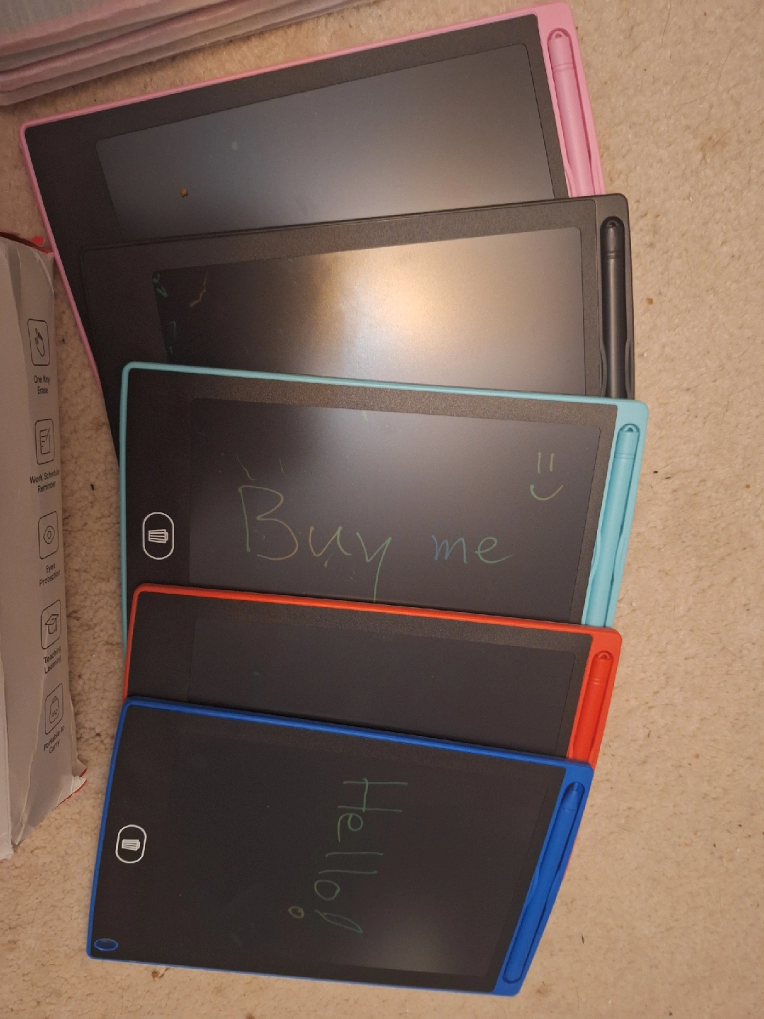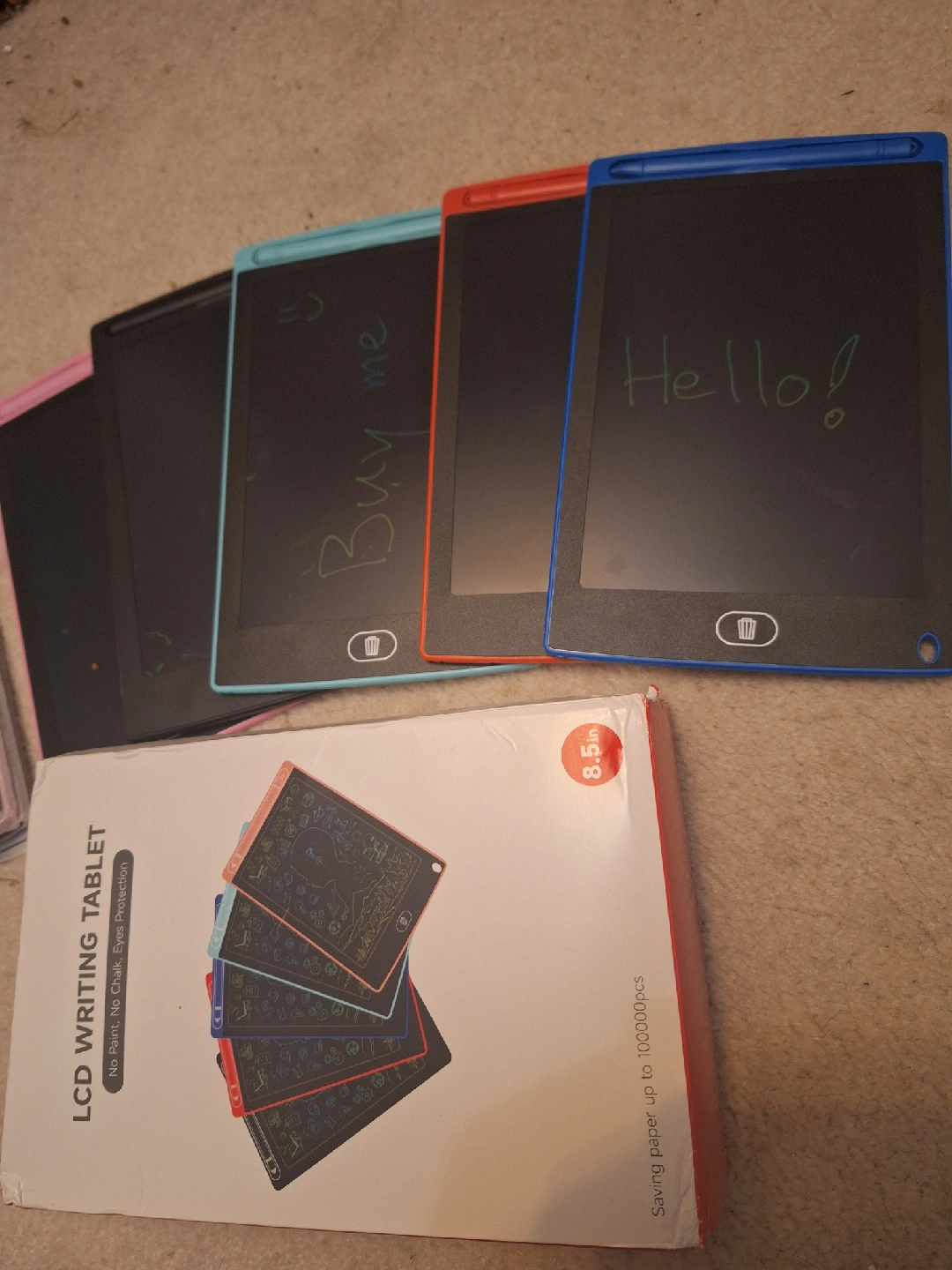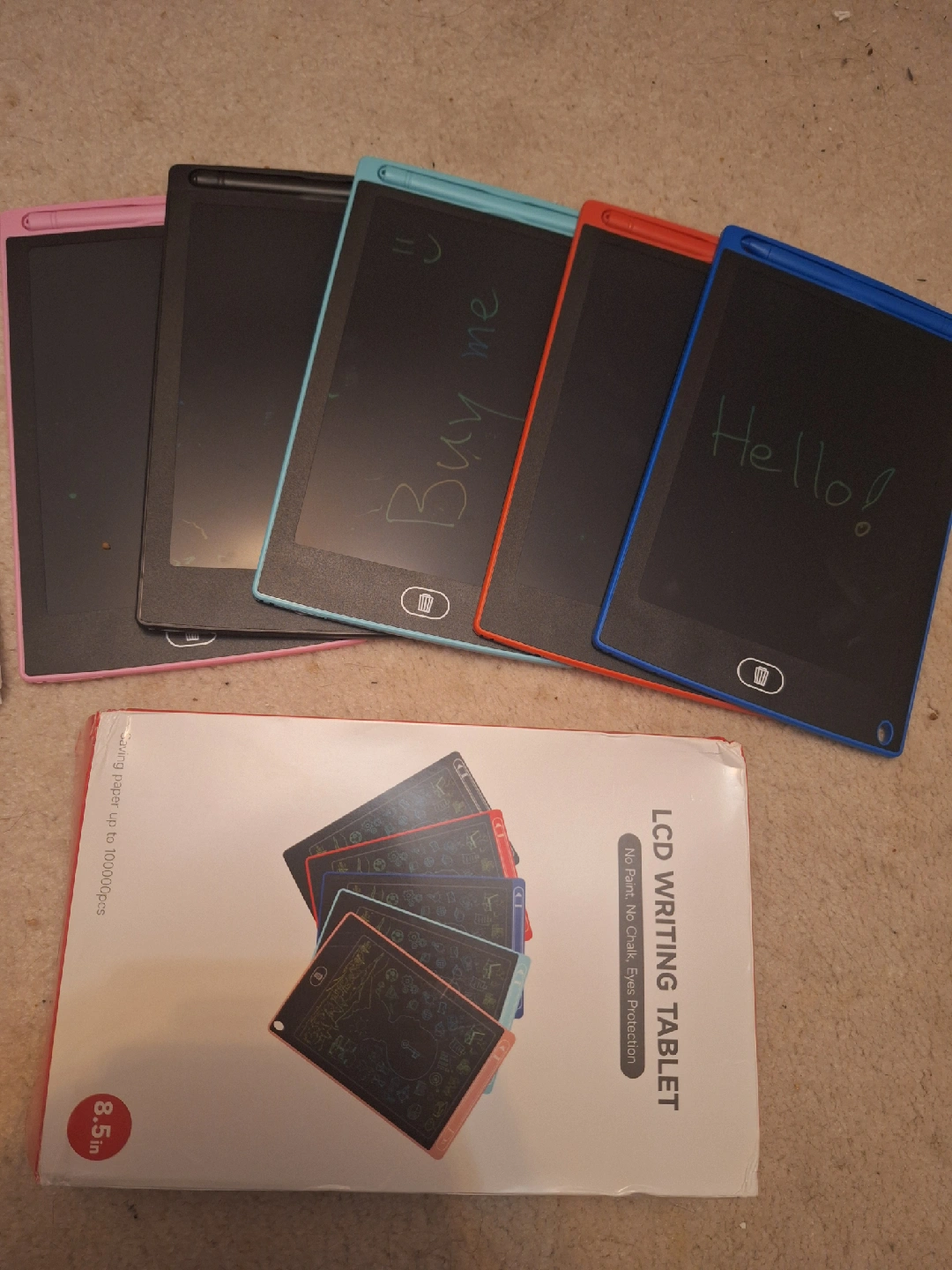 I'm selling some brand new LCD Writing Tablets. They're 8.5 inches each and come in 5 different colours!