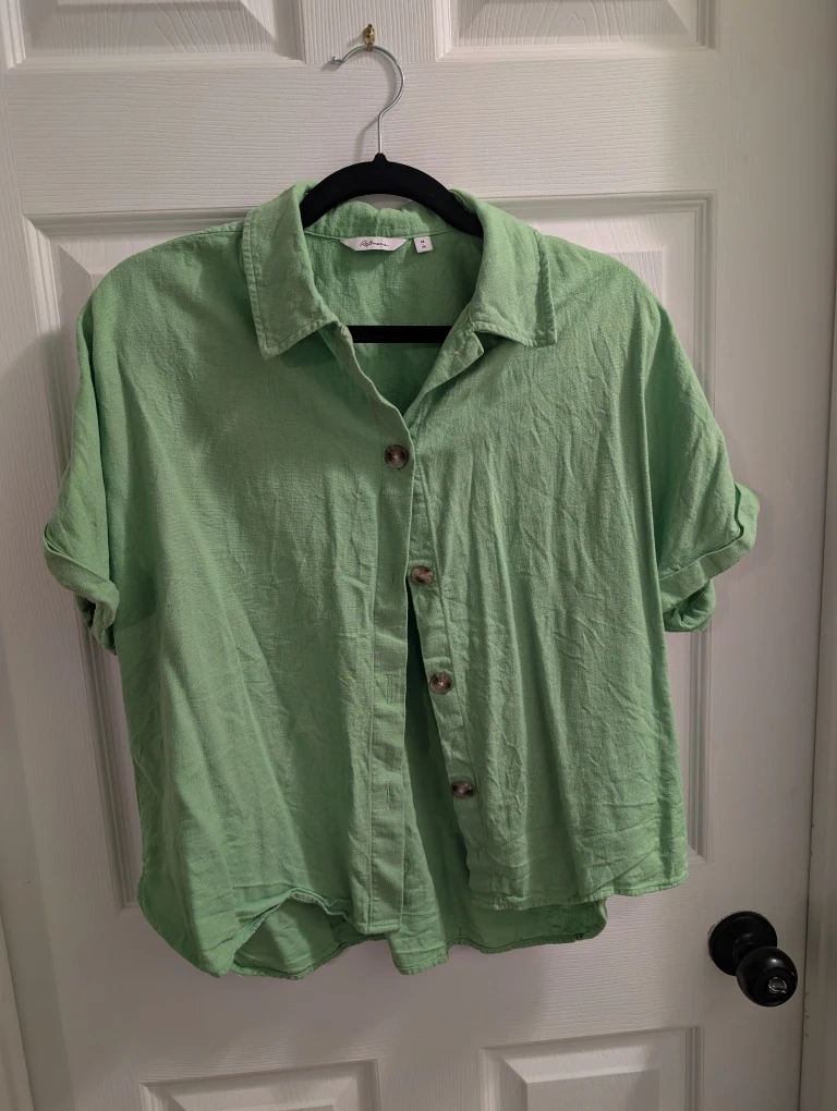 Selling a cute Reitmans button-up shirt in a lovely green colour! It's a size M and in great condition. Perfect for a casual day out or dressing up for a more polished look