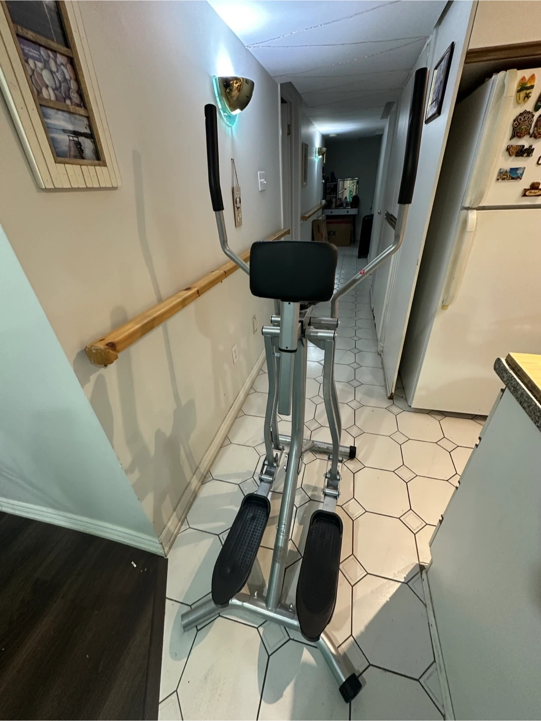 Selling an elliptical exercise machine! It's great for getting a workout in at home. The dimensions are approximately 151.2 cm in height, 97 cm in length, and 60.3 cm in width.
