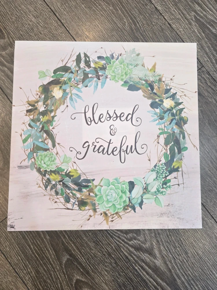 A cute wall decor piece with a wreath design and the words 'blessed & grateful' printed on it. It's perfect for adding a touch of warmth to any room