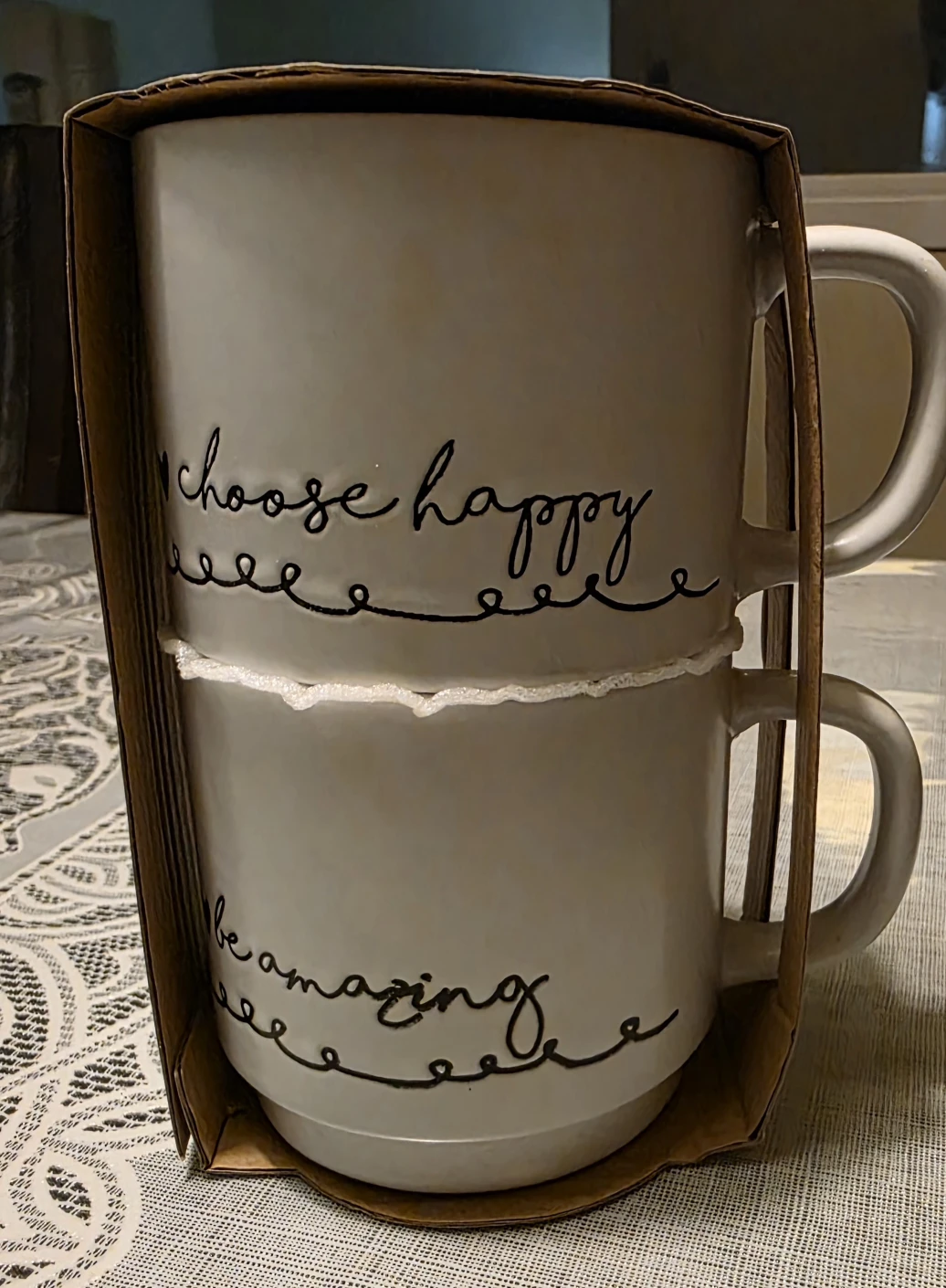 Selling a set of two stackable mugs from Sheffield Home! They come in their original box and are dishwasher and microwave safe. One mug says "choose happy" and the other says "be amazing".