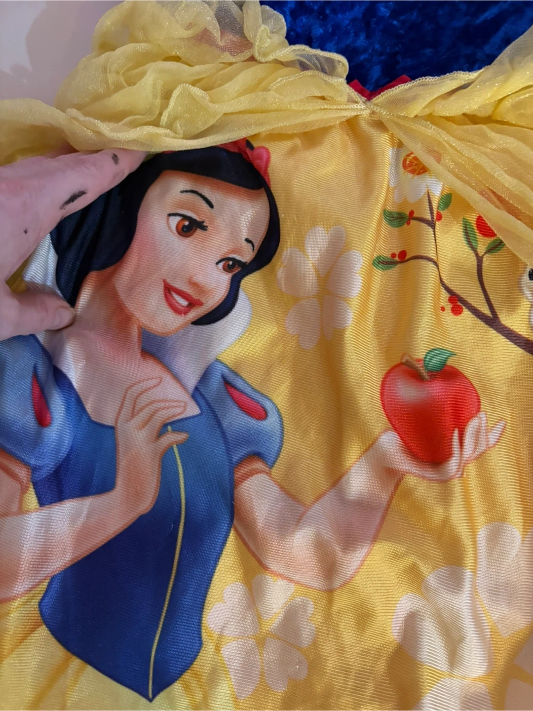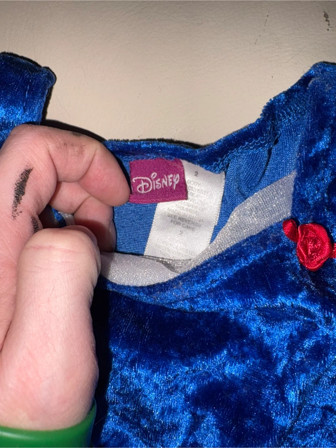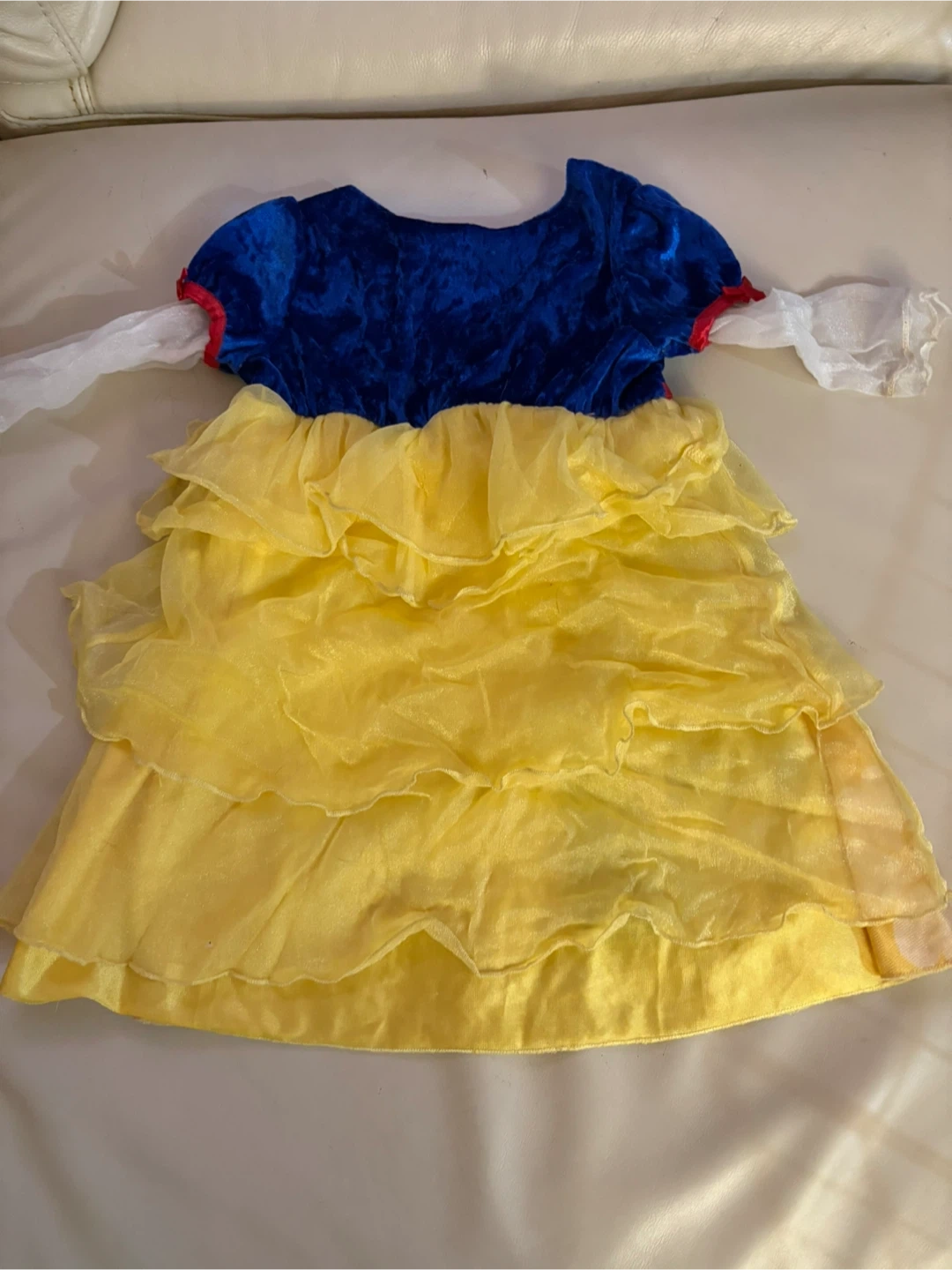 Selling a cute Disney Snow White costume! It's a size 2 and features the classic Snow White design with a blue velvet top and yellow skirt. Perfect for dress-up. $10