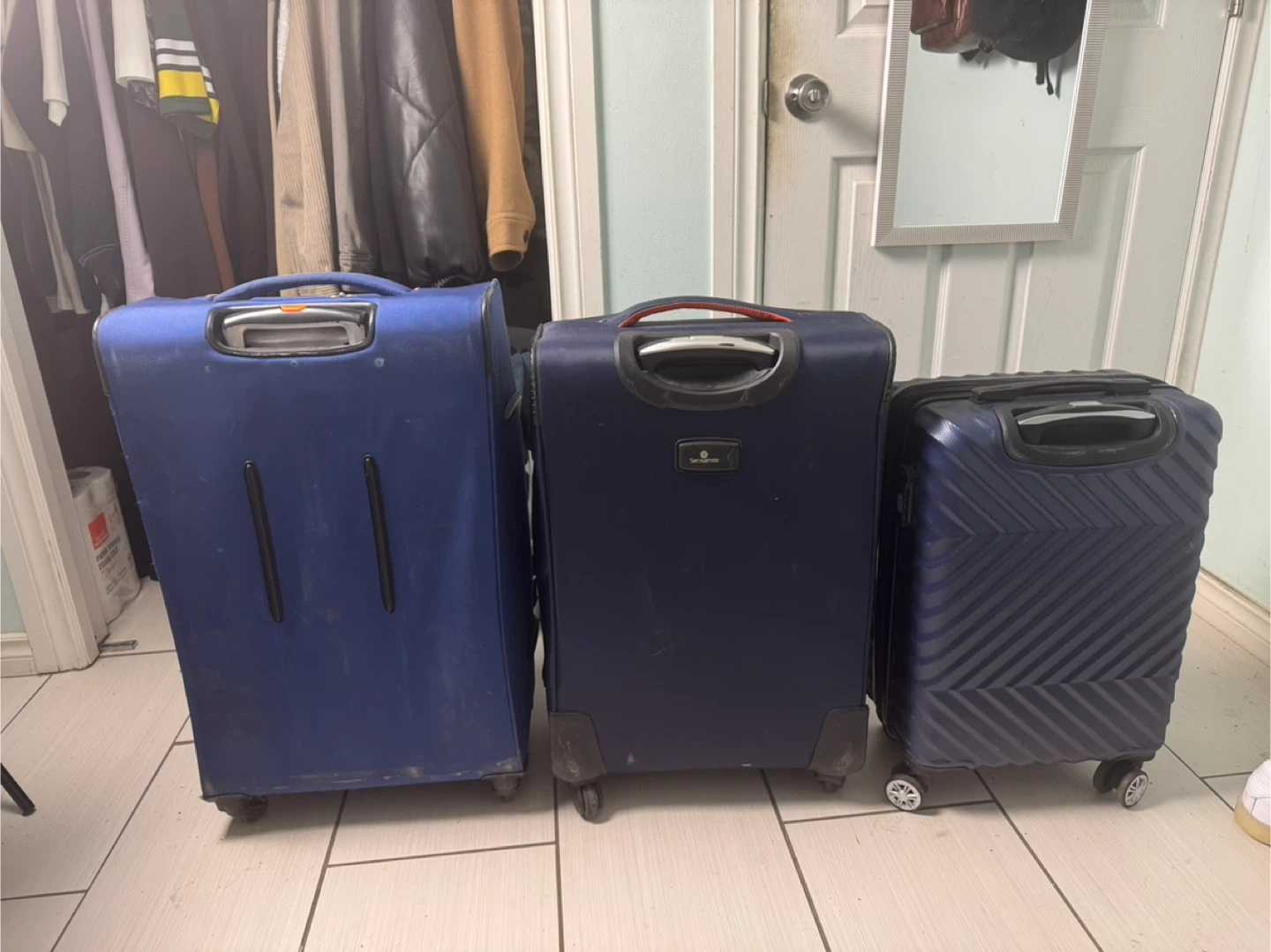 Selling a set of three suitcases. They are all in good condition and ready for your next adventure! The set includes a 28in large blue 'IT Luggage' suitcase, a 26in medium navy suitcase, and a 22in smaller dark blue 'Toscano' suitcase