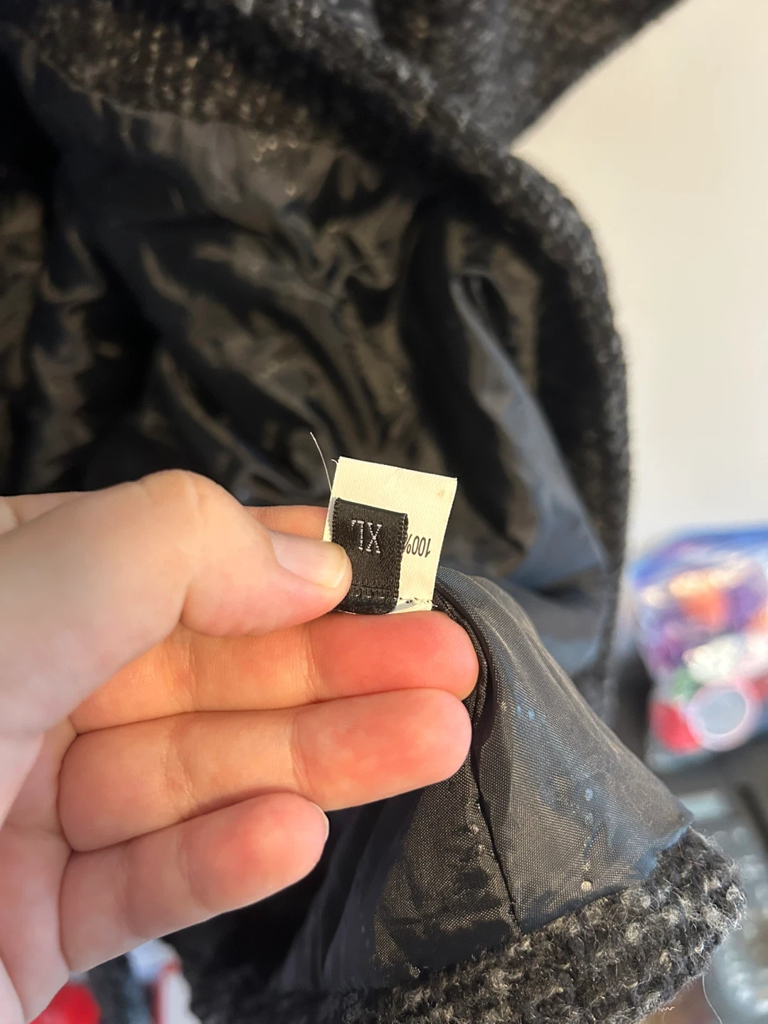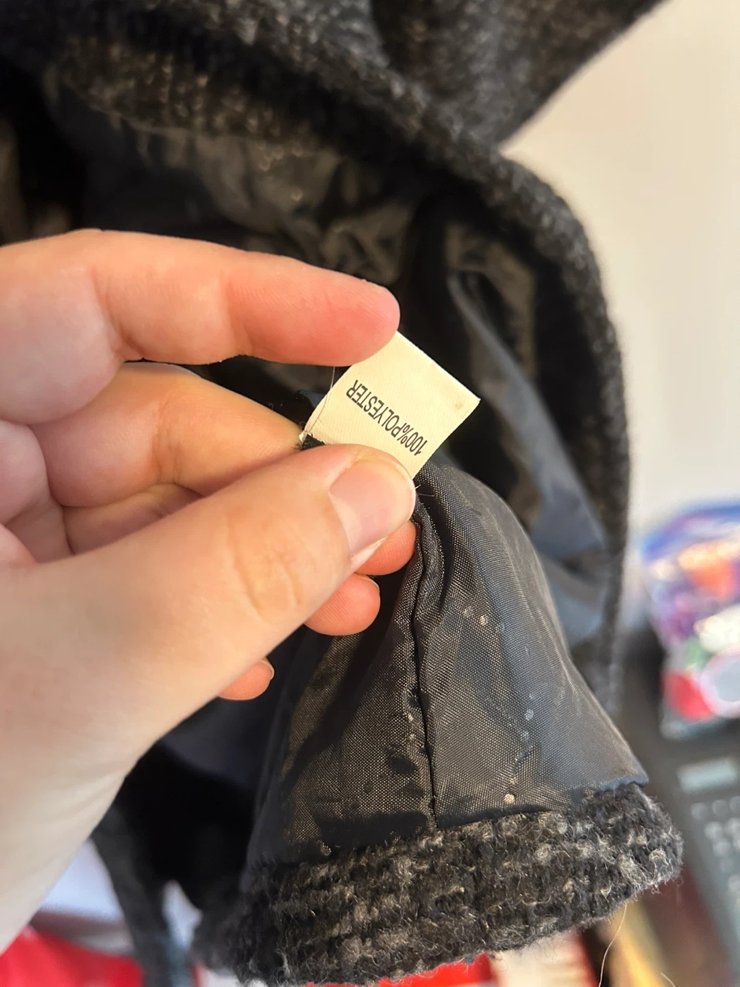 Jing xiu brand. Funky hooded jacket with 3/4 length sleeves and puff loop closure. Black & grey knit, medium weight. Size xl. Brand new condition