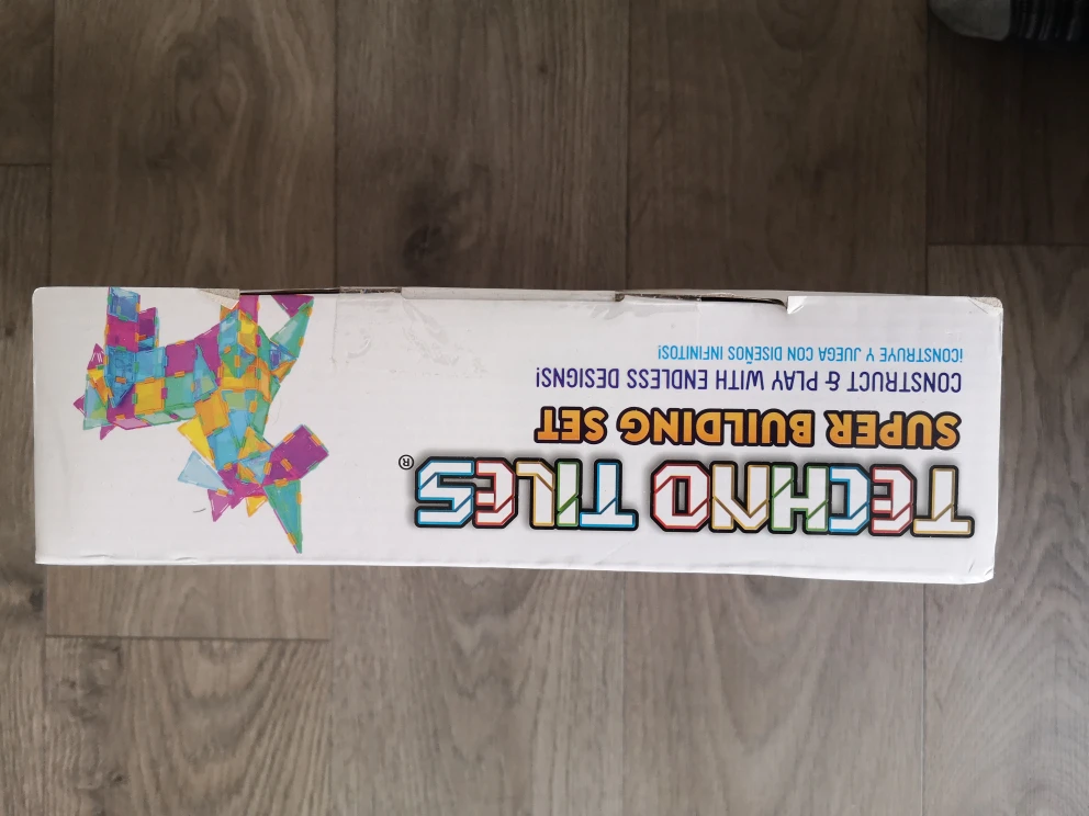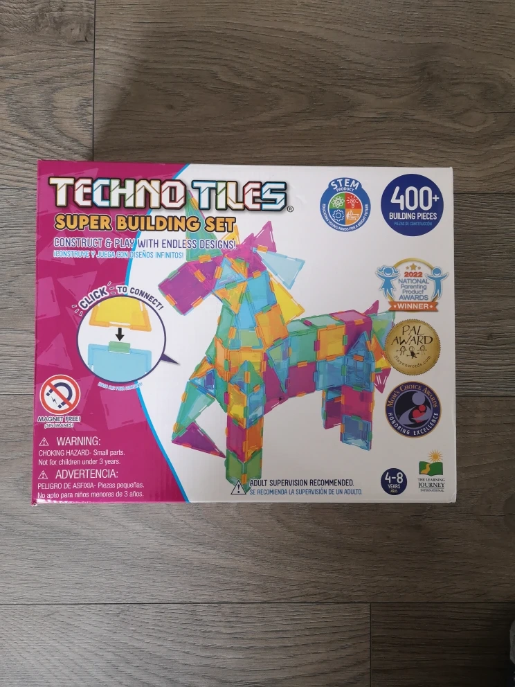 Techno Tiles Super Building Set for endless designs! Includes over 400 pieces to construct and play with. Recommended for ages 4-8. The box is included!