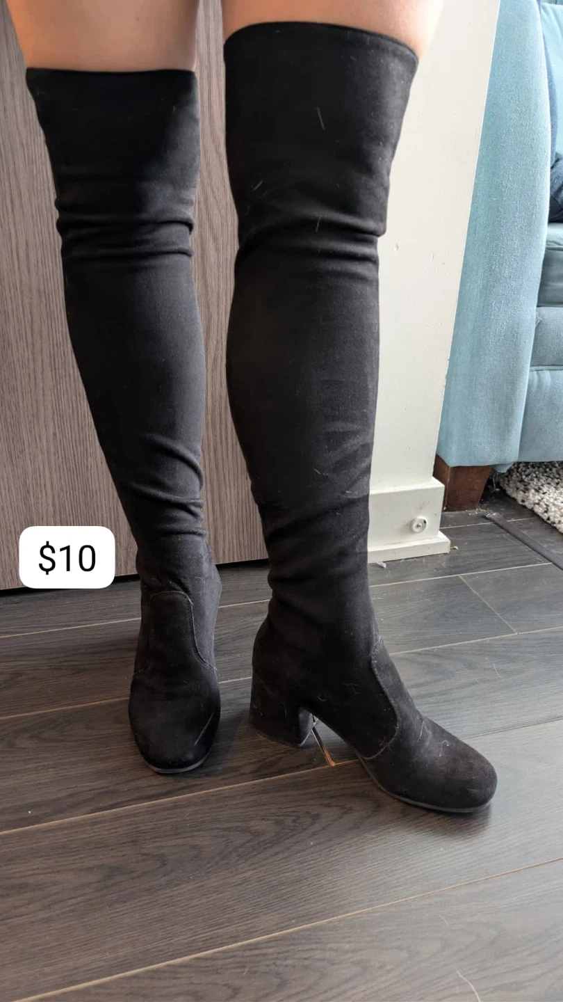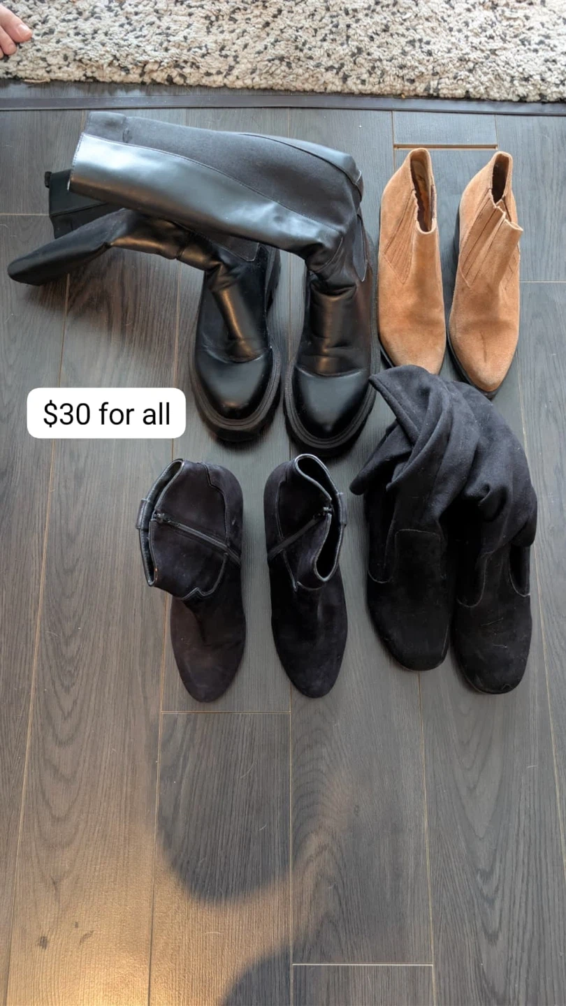 Selling a collection of women's boots. There are 4 pairs in total, including ankle boots and thigh high boots. All are in used condition. $20 for all!