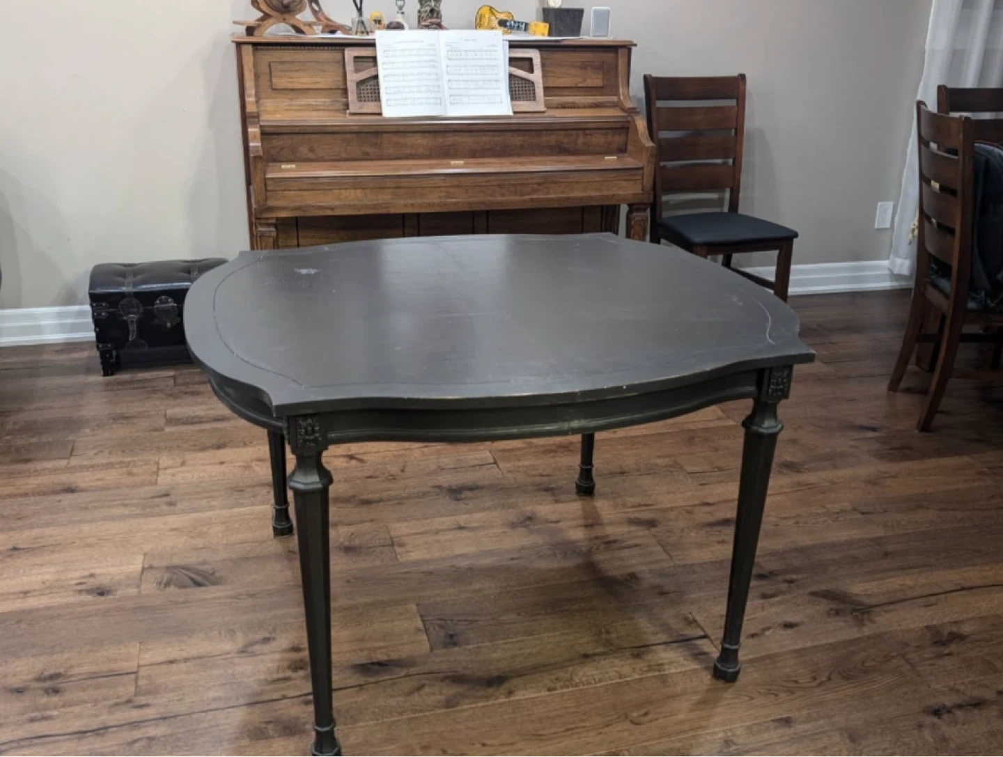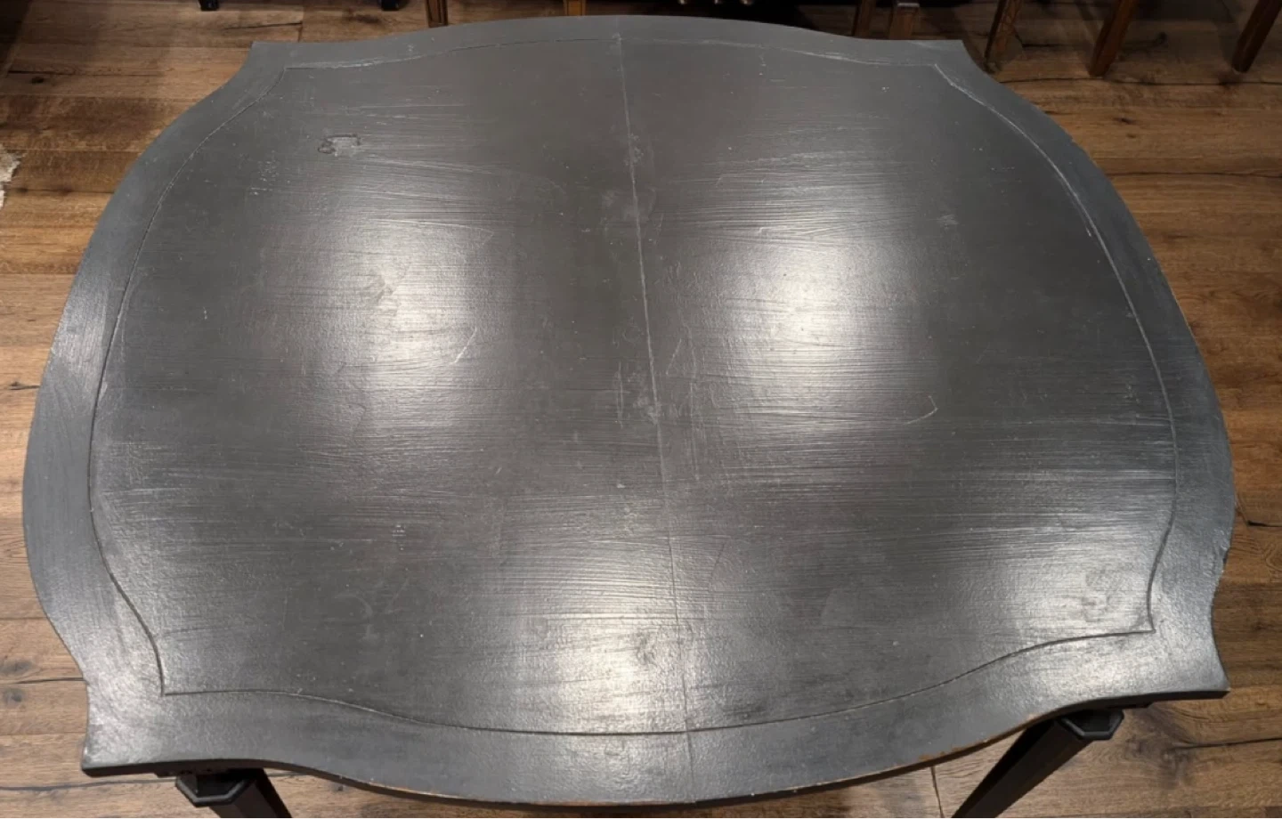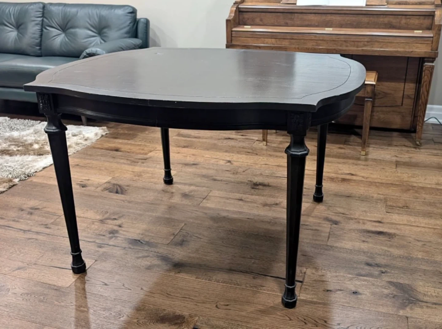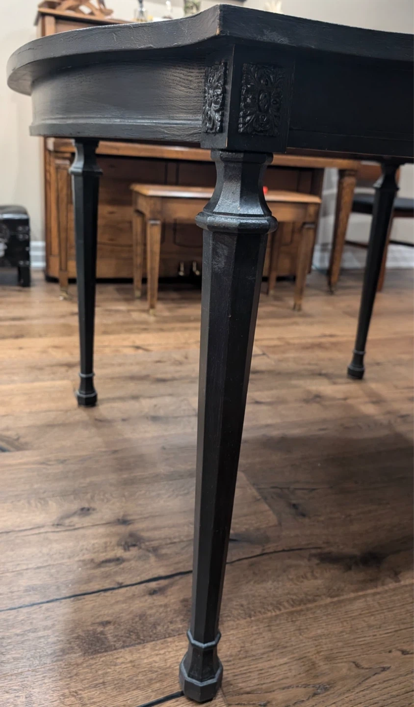 Antique black-brown wood table. It's sturdy, and in good vintage condition, but could use refinishing as there is some paint peeling. This table has a unique design with beautiful carved details on the legs and edges, and a curved shape.