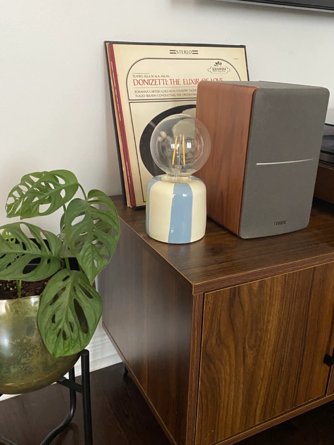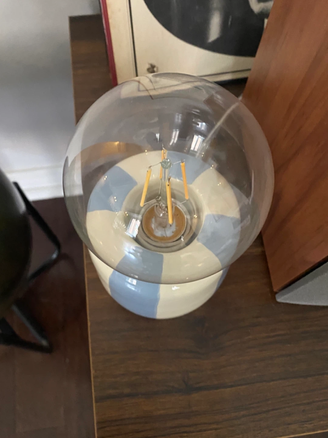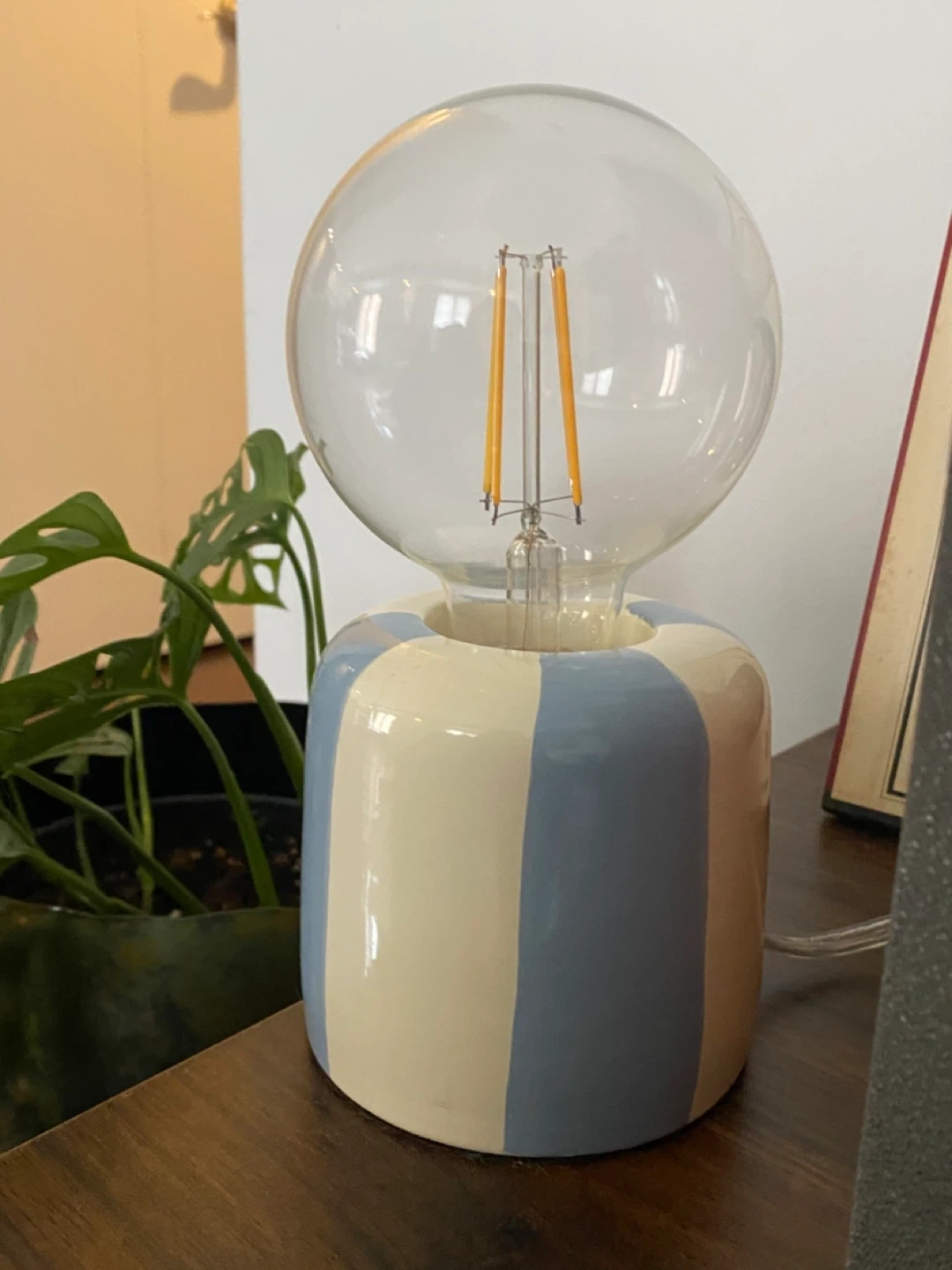 Cute little table lamp with a striped ceramic base! It gives off a nice, warm light and would be perfect for a bedside table or desk. Has a clear wire and switch.
