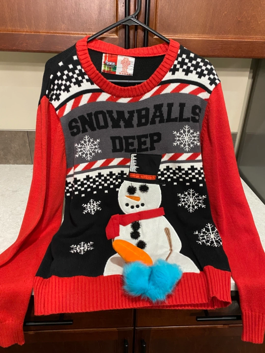 Get ready for the holidays with this fun and festive "Snowballs Deep" Christmas sweater! It features a snowman design and is perfect for adding some humour to your holiday wardrobe.