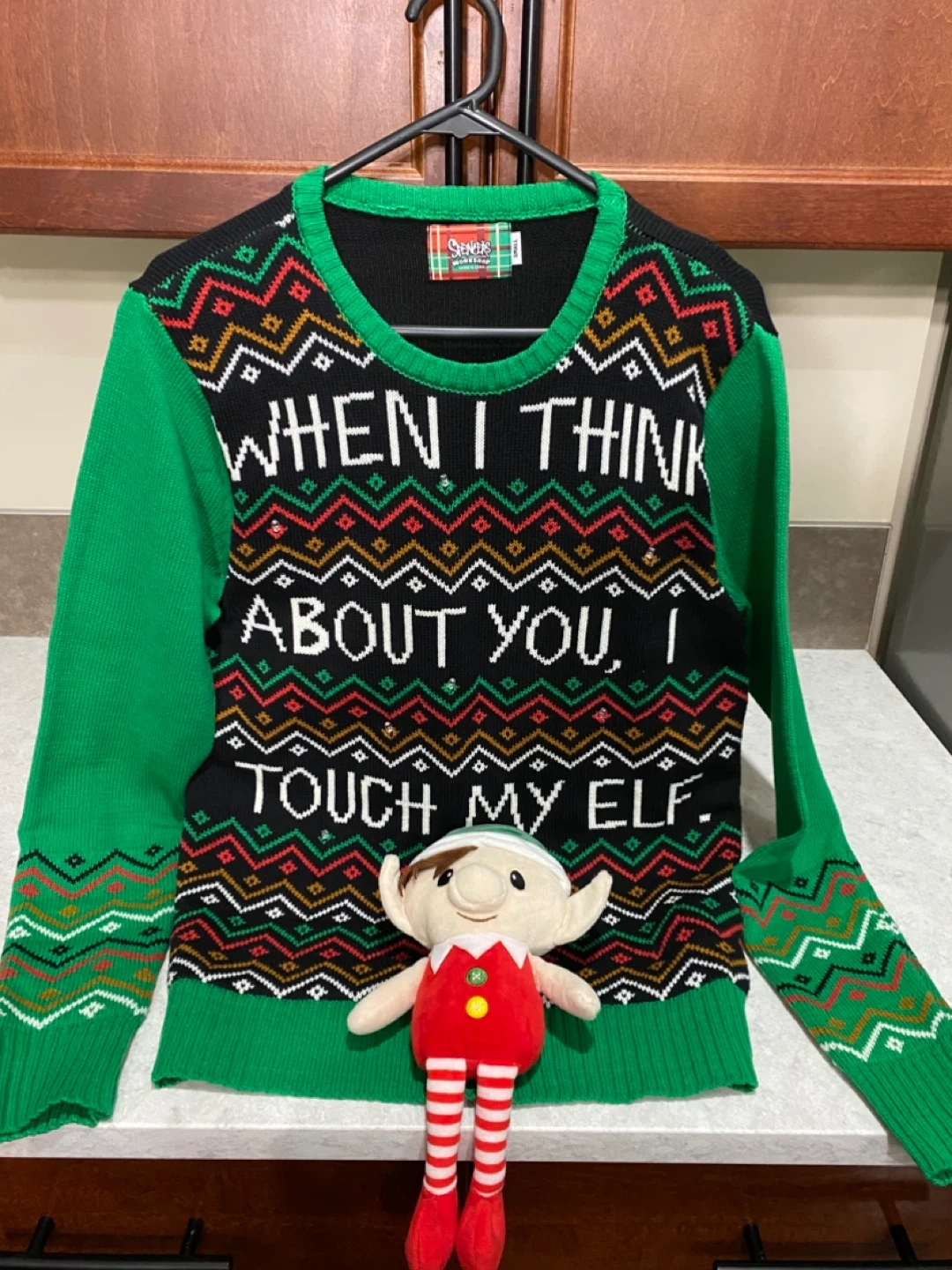 This is an ugly Christmas sweater in size Small. It is green, black, red, and white with a funny saying on the front.