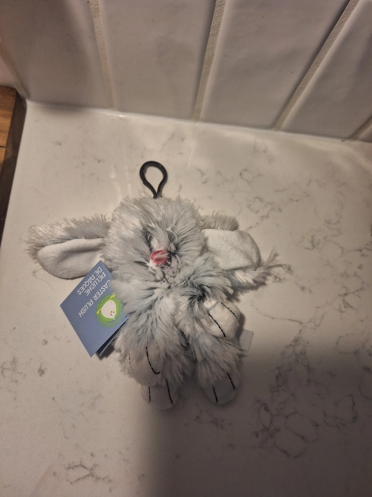 Here's a cute Easter plush bunny! It's a fluffy, grey bunny with a little loop on top so it can be hung up. Perfect for Easter decorations or as a small gift for someone special