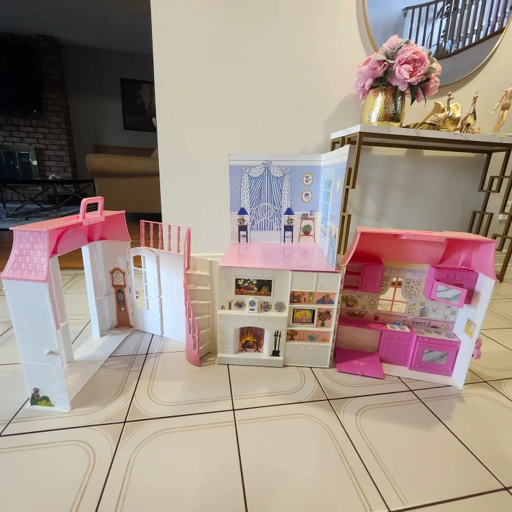 Selling a cute Barbie dollhouse in pink and white! It's in great shape and ready for a new home. This dollhouse folds up for easy storage and portability. Perfect for any Barbie fan!