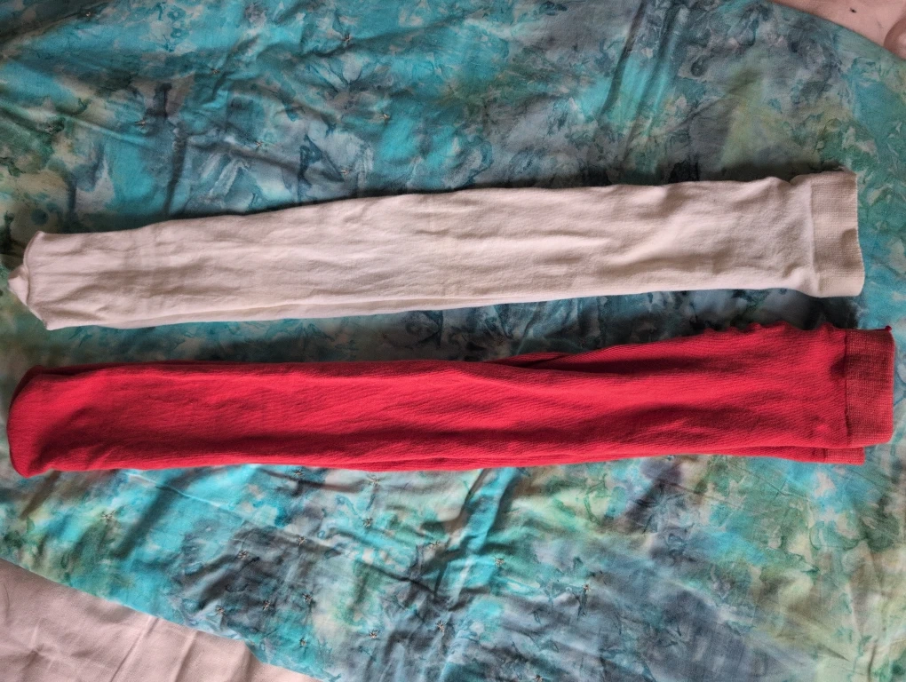 Selling two pairs of tights from H&M. One is white and the other is red. The size is 6X/7.