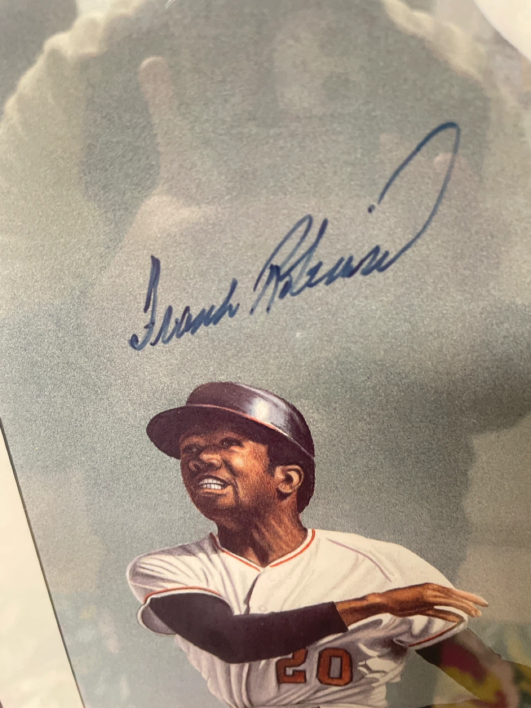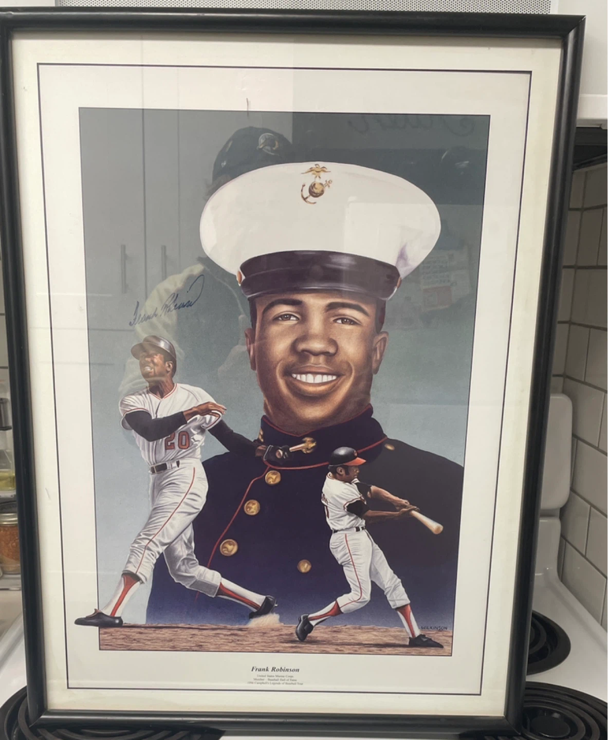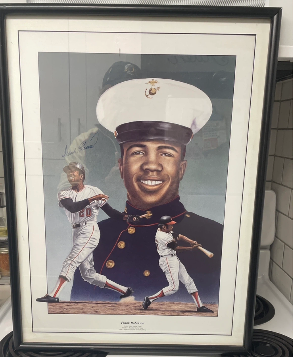 The framed print is a Frank Robinson signed and numbered lithograph/print that highlights his time with the U.S. Marine Corps and his baseball career. This specific artwork was part of a limited edition run, and signed and numbered examples have sold for around $475 USD unframed.