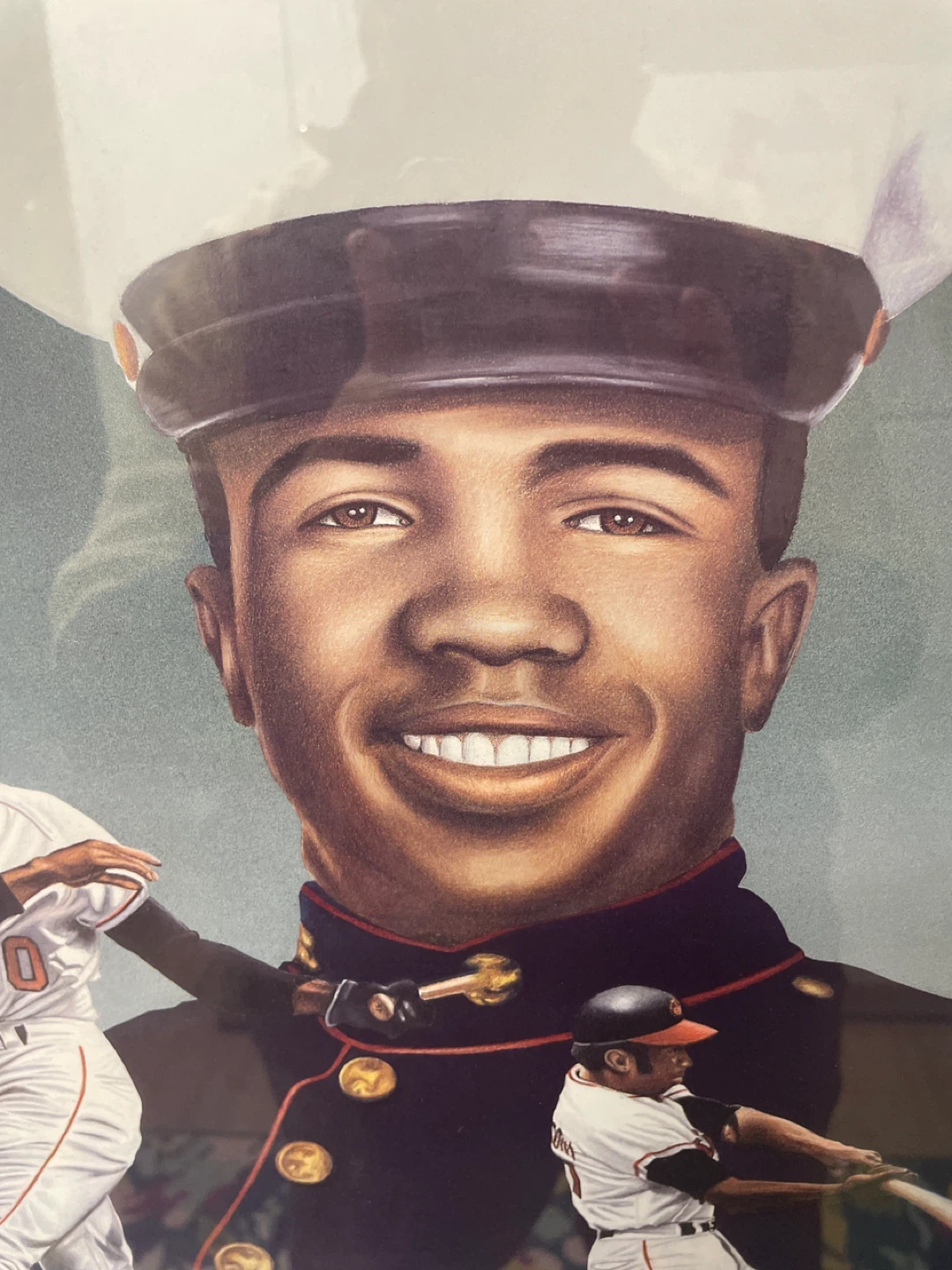 Subject: Baseball Hall of Famer Frank Robinson, showcasing his military service in the U.S. Marine Corps alongside images of him playing baseball.
