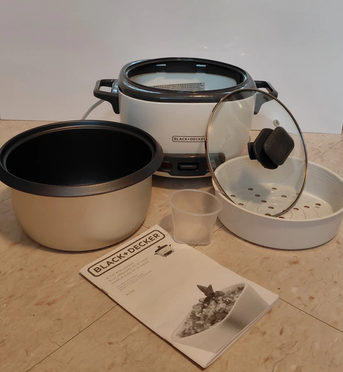 Selling a Black+Decker 16-cup rice cooker! It comes with the inner pot, lid, steaming basket, measuring cup, and instruction manual. Perfect for making large batches of rice for family dinners or meal prepping