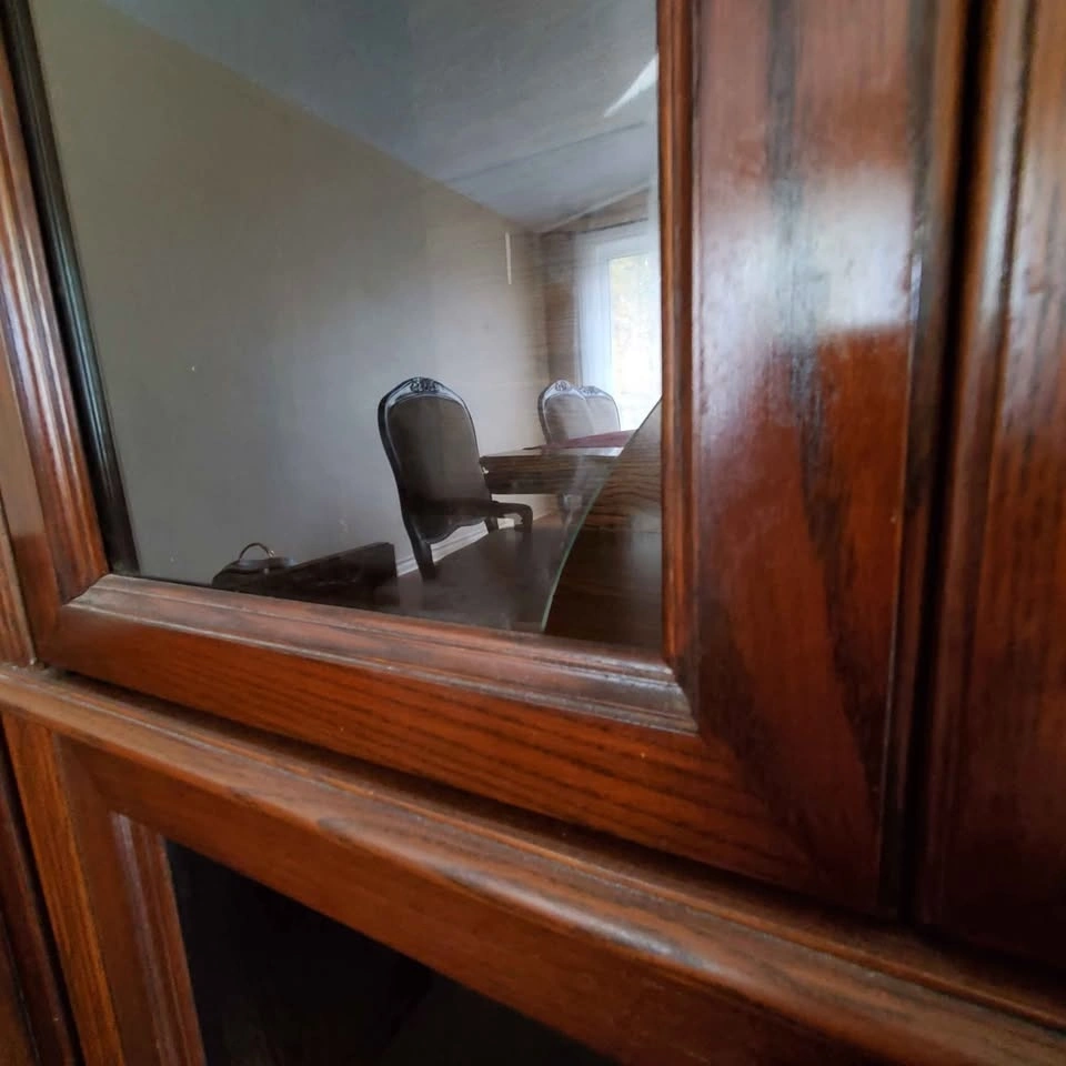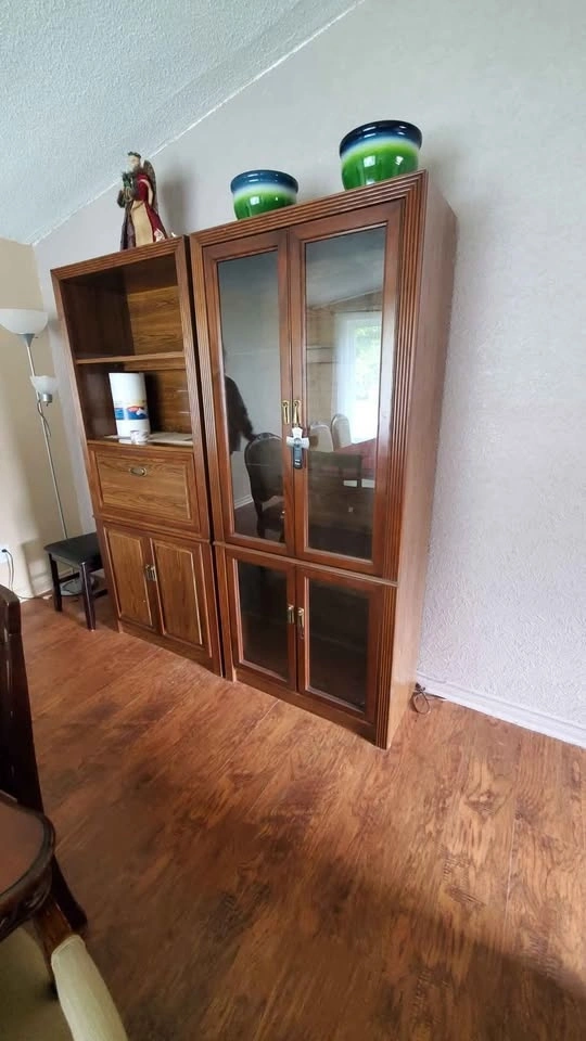 Selling a wooden hutch / wall unit with lots of storage. Features open shelving, closed cabinets, and two glass-door display sections. Great for storage, extra pantry space, display items, dining room, basement, or garage use.