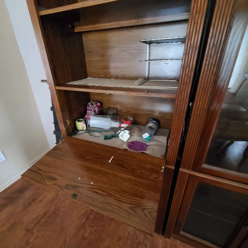 The structure is still solid. Doors open/close properly. Perfect for someone who needs extra storage, wants a budget-friendly piece, or enjoys refinishing projects.