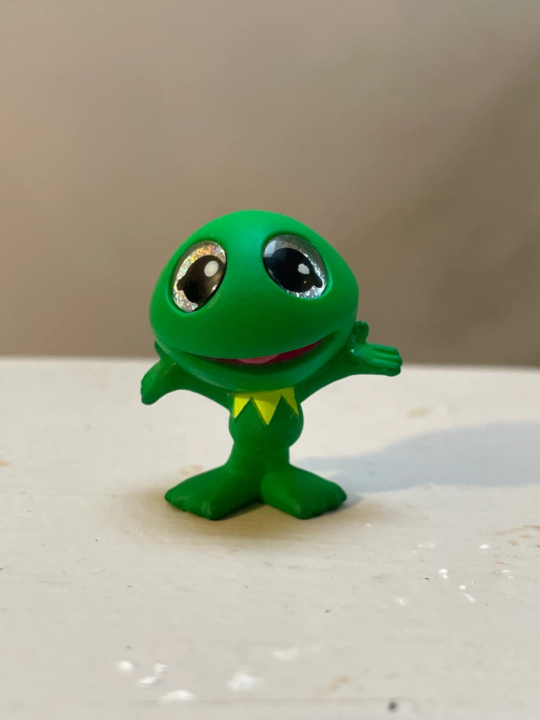 Here's a cute Kermit the Frog figurine! It's green with a yellow collar. Perfect for any Muppets fan or collector