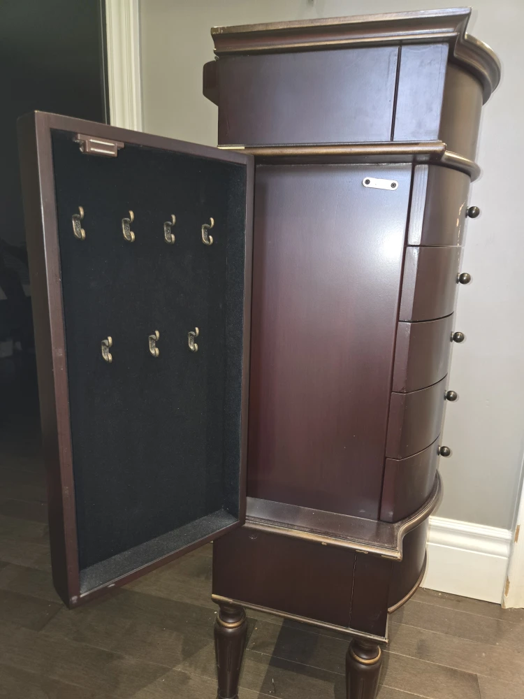 Selling a jewelry armoire in brown. It has some wear and tear, as shown in the photos, but is still functional and has lots of storage space for your jewelry and accessories