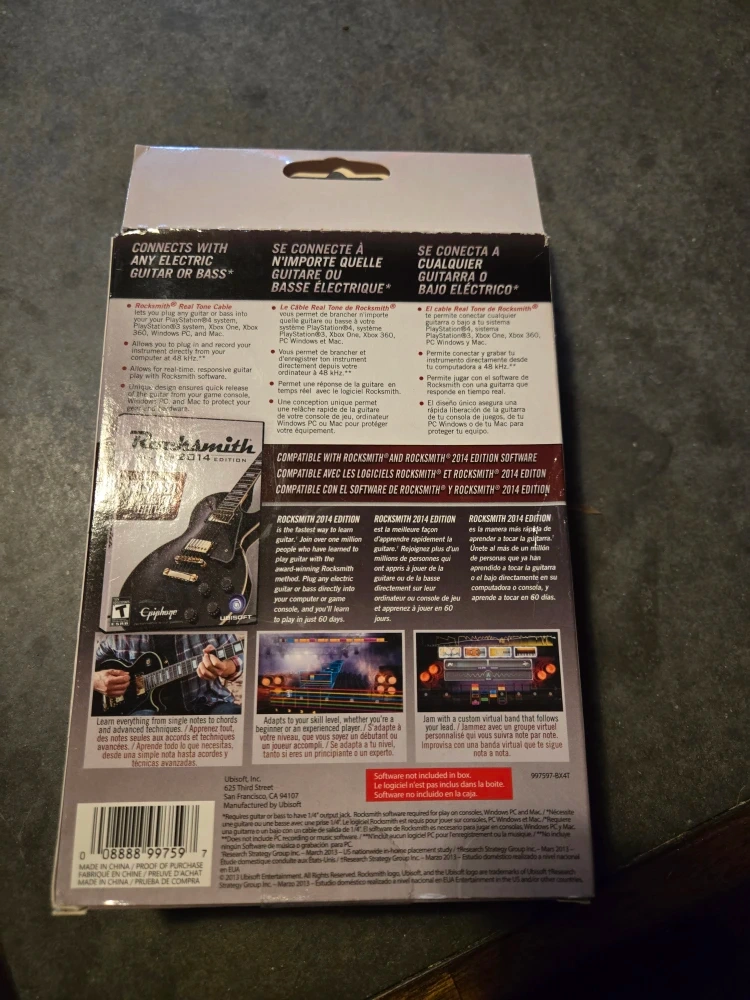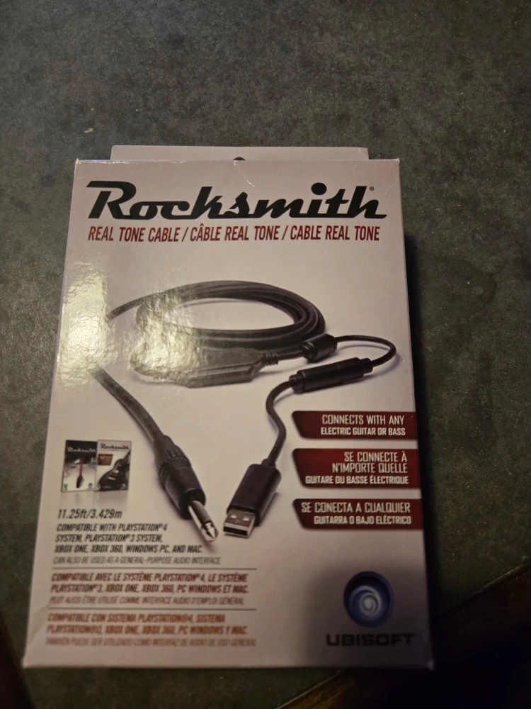 Selling a Rocksmith Real Tone Cable! It connects to any electric guitar or bass. It's compatible with Playstation 4 system, Playstation 3 system, Xbox One, Xbox 360, Windows PC, and Mac. Also included is a general-purpose audio interface