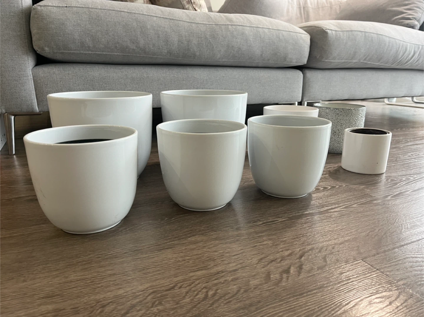 Selling a set of 7 white ceramic plant pots. They're in great condition and perfect for adding a clean, modern look to your plants and home decor! Without plants.