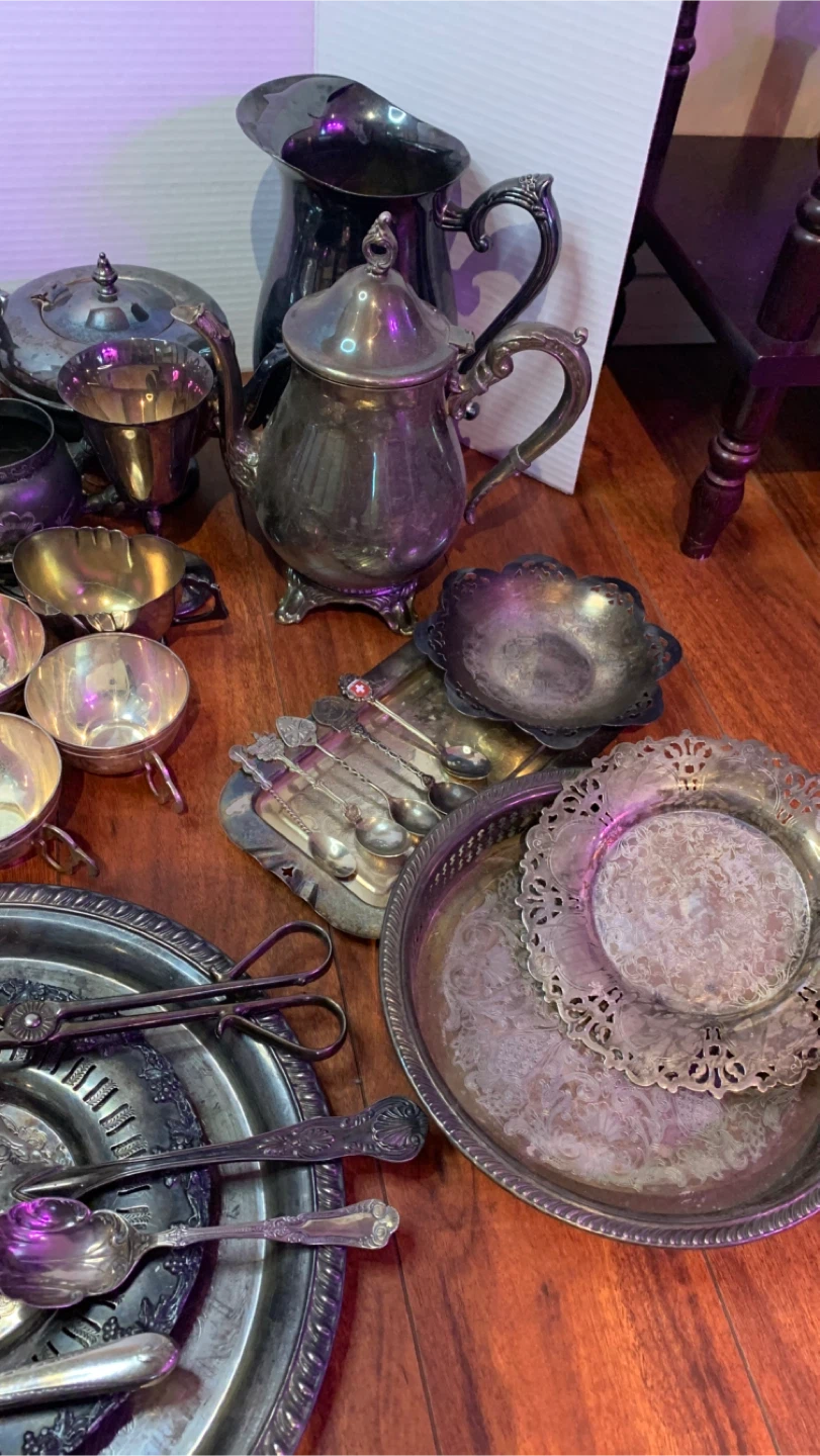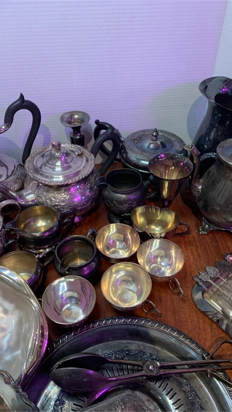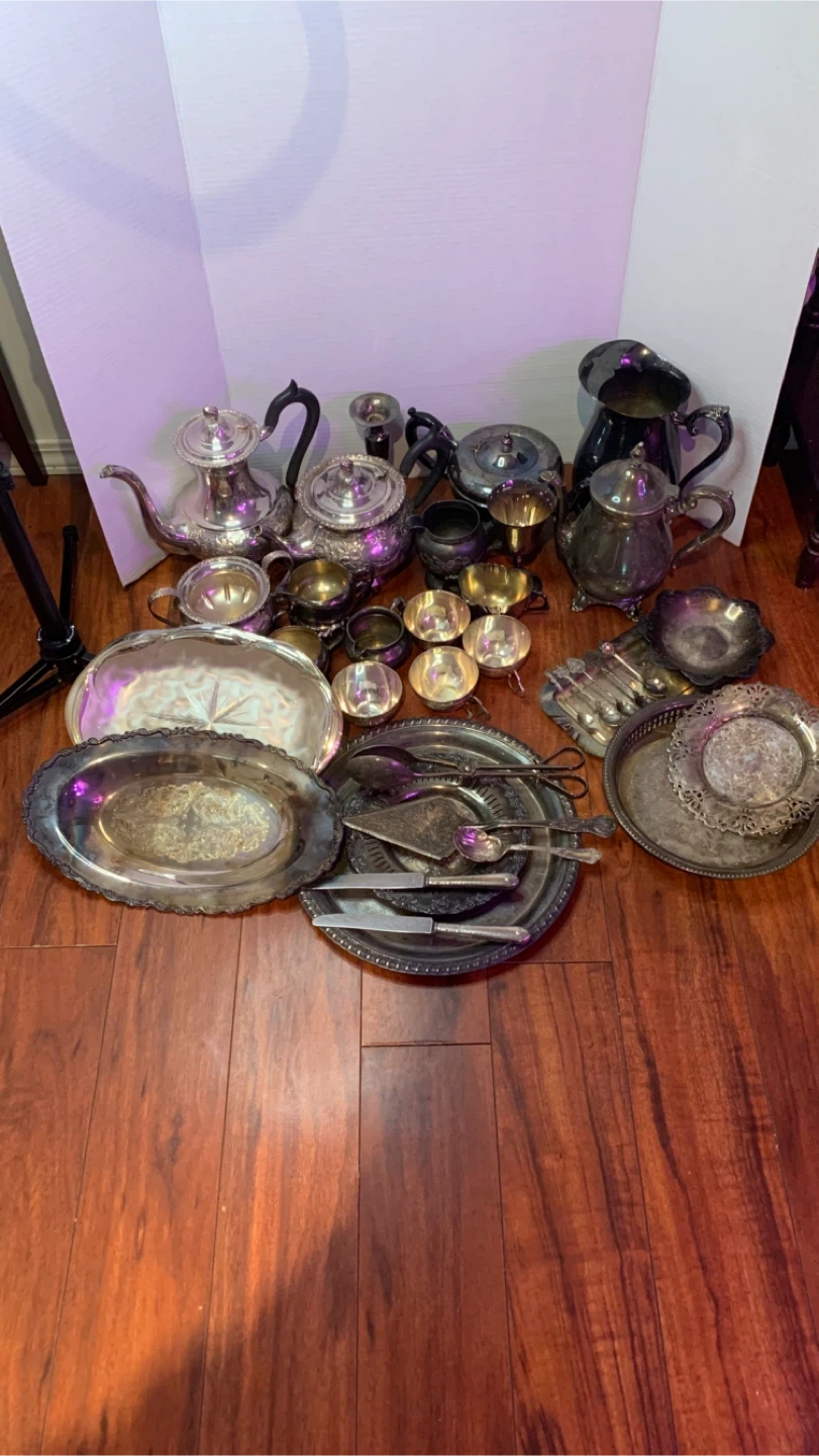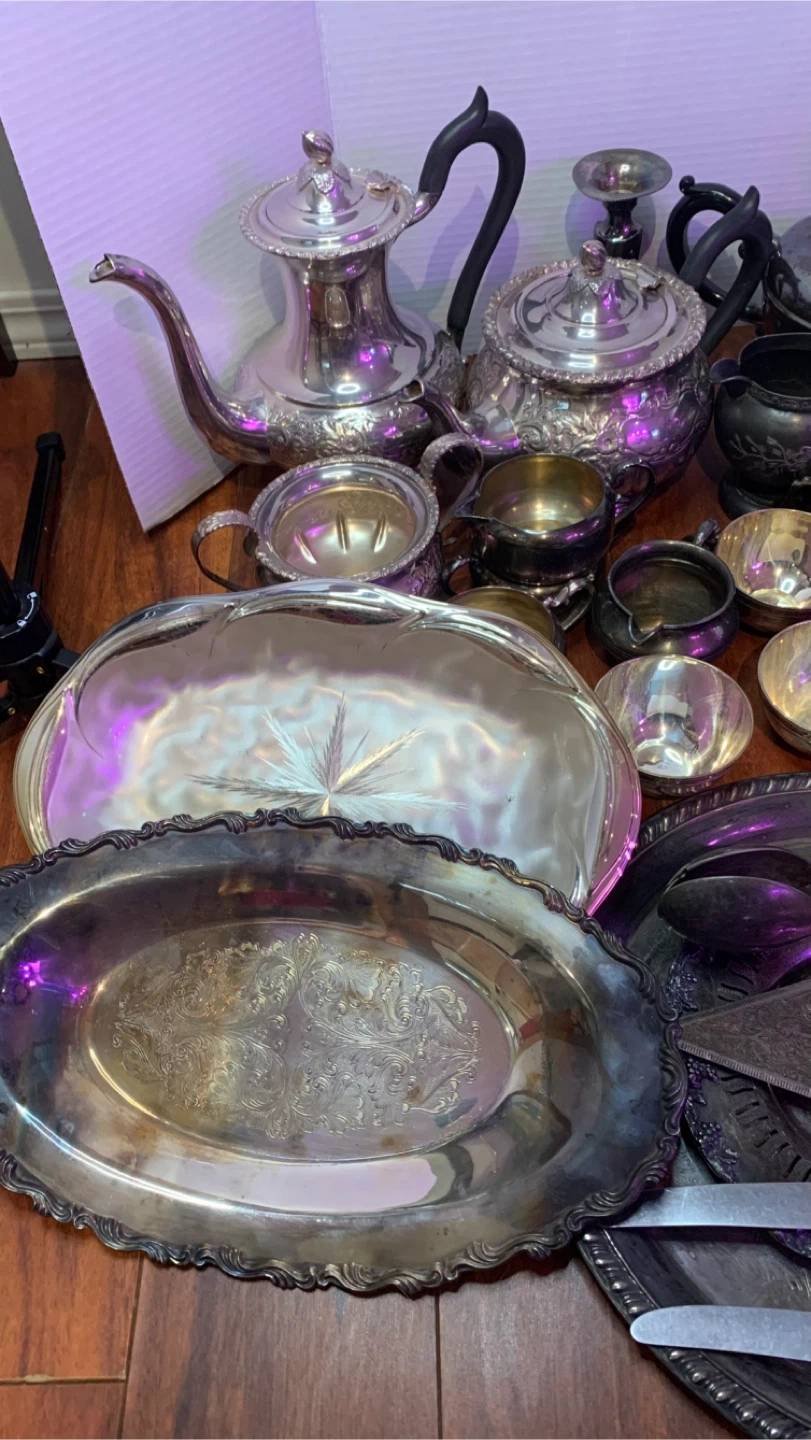 2 tea pots, 2 coffee pots,7 cream/sugar,5 cups,1 pitcher,1 vase,8 trays/platters & 10pc cutlery/serving pieces