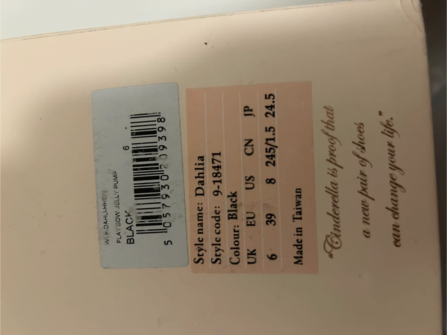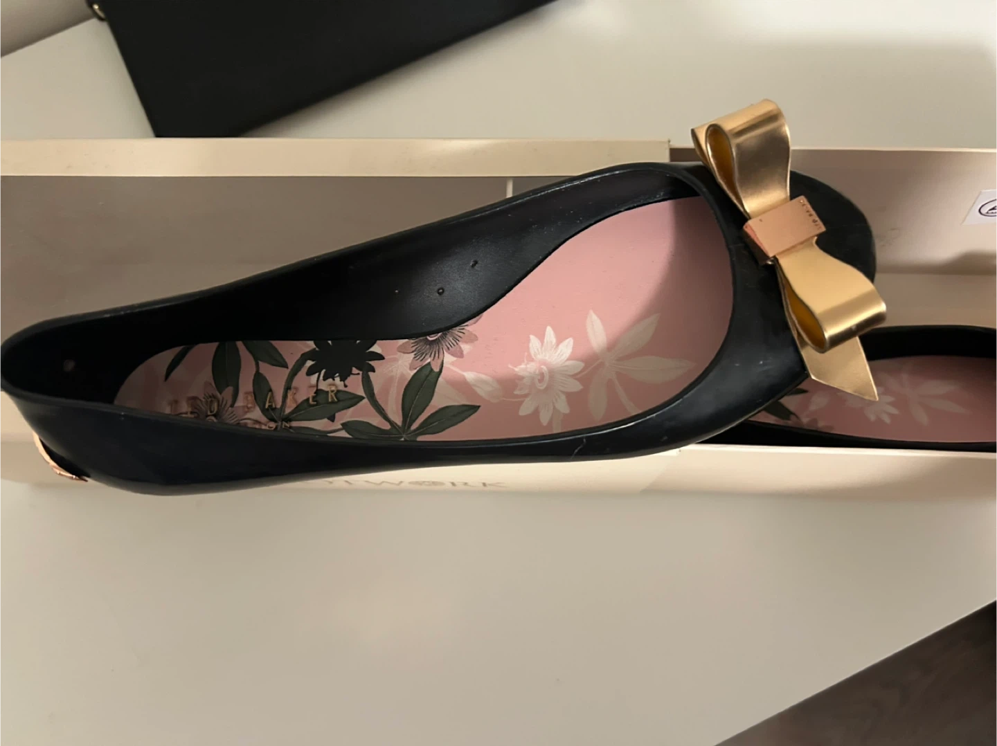 Selling a pair of Ted Baker Dahlia Flat Bow Jelly Pumps in black, size 8 (US)/39EUR. These stylish flats feature a cute bow detail and are perfect for adding a touch of elegance to any outfit. The style code is 9-18471. Made in Taiwan