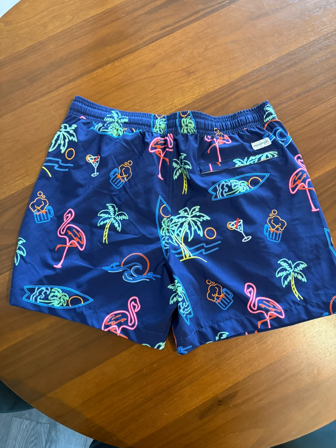 These swim trunks are in great condition! They feature a fun neon pattern with flamingos, palm trees, and surfboards on a navy blue background. Perfect for the beach or pool!