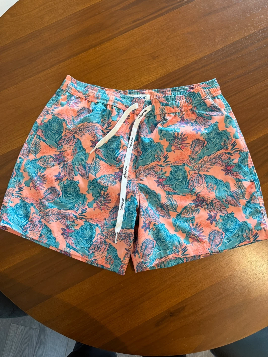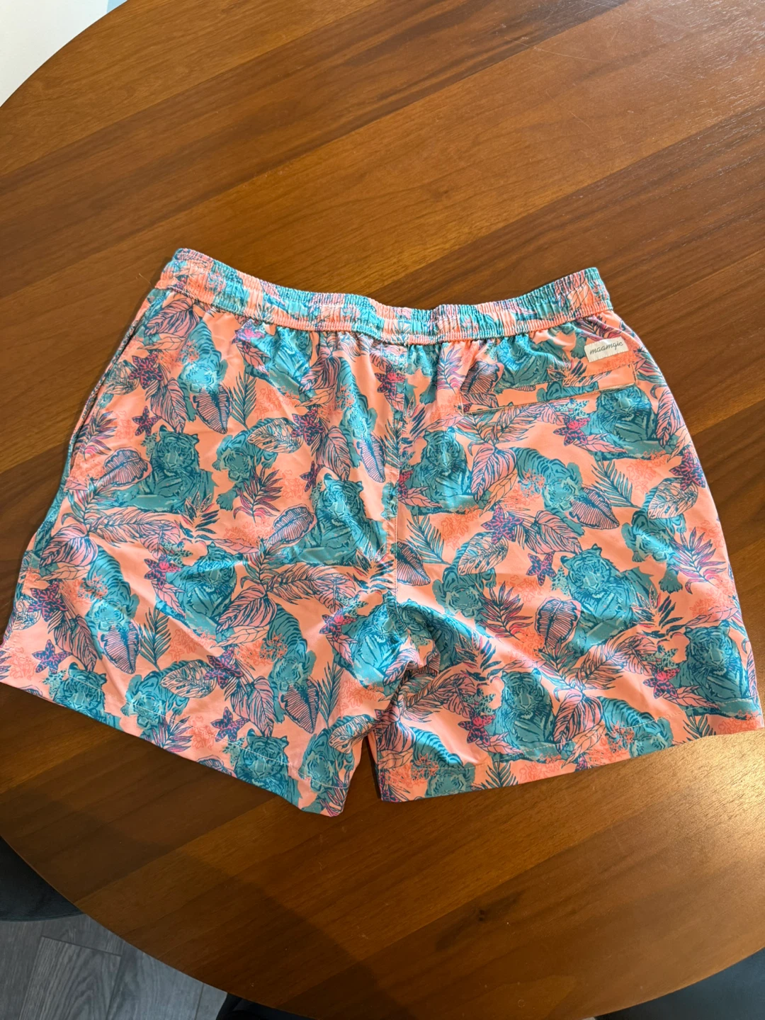 Selling a pair of swim shorts in size medium! They feature a fun and vibrant floral and tiger print in shades of coral and blue. Perfect for the beach or pool