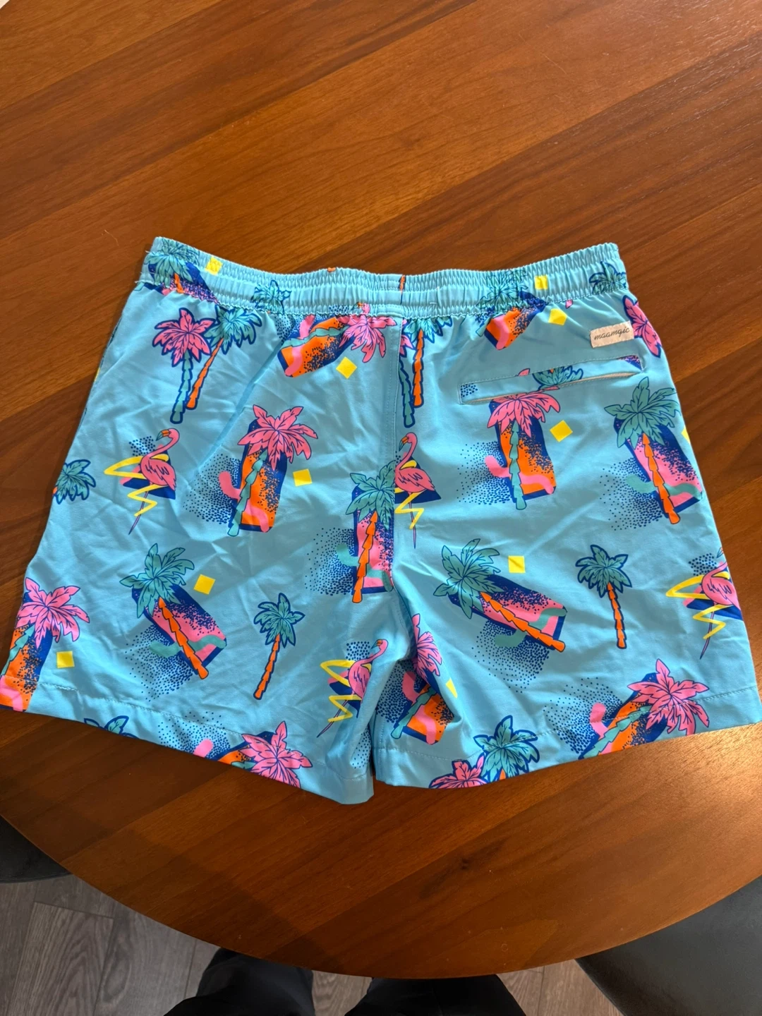 These swim shorts are perfect for summer! They feature a fun tropical print with palm trees and flamingos. They're a size medium and in great condition