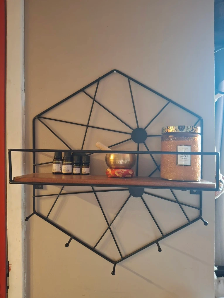 Stylish sturdy geometric wall shelf with a wooden shelf. Black metal frame with a unique design.