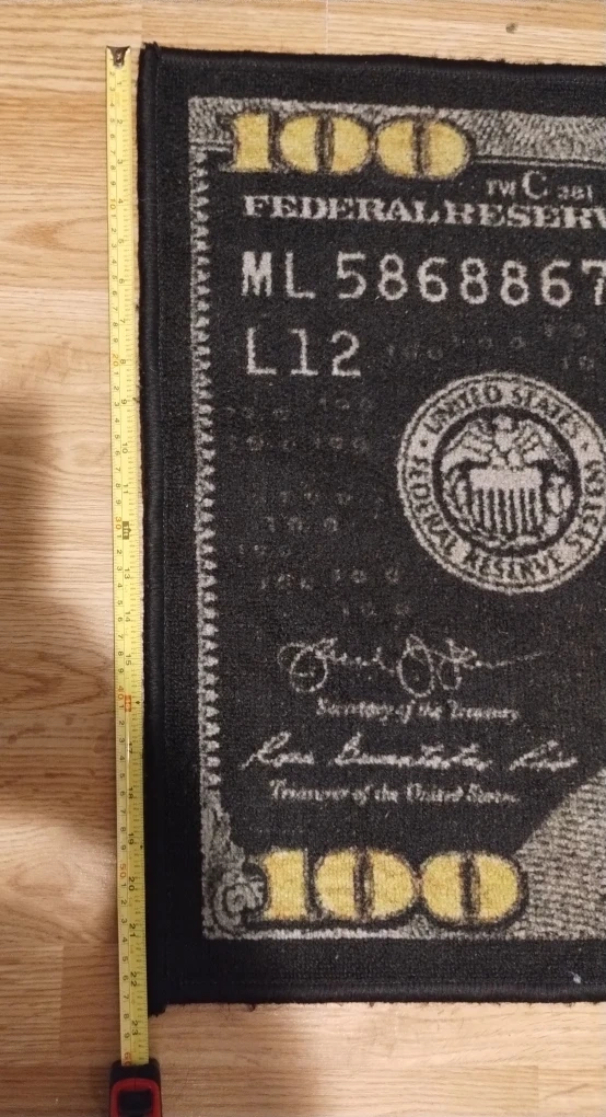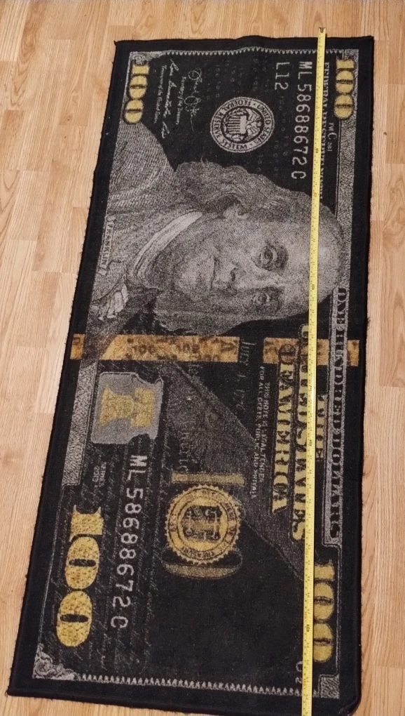 Check out this fun novelty rug! It's designed to look like a $100 bill. It measures about 23 inches wide and 52 inches long, making it a great conversation starter for any room
