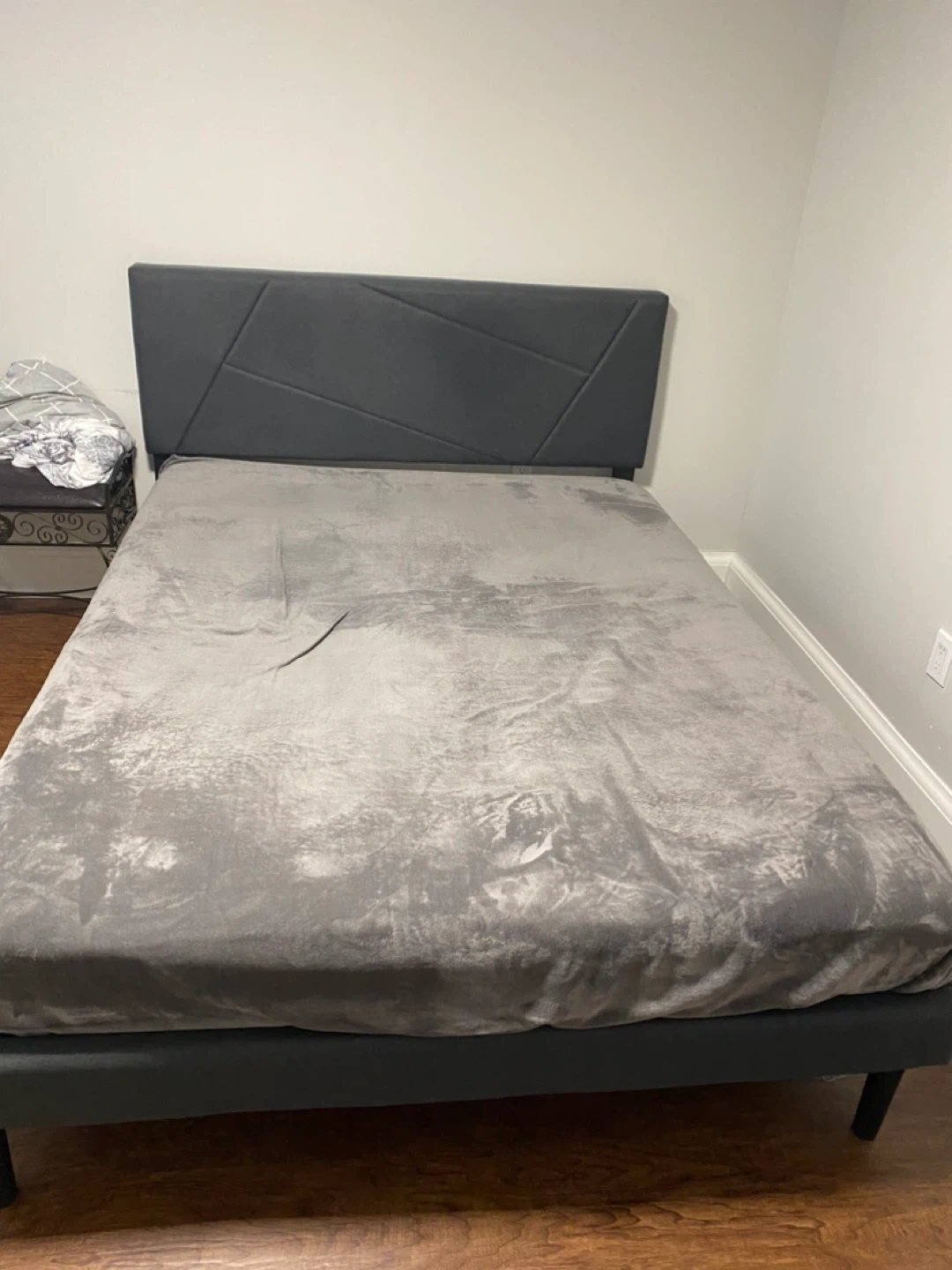 Selling a grey bed frame in good condition. It's a simple and stylish design that would fit well in any bedroom. The bed frame is sturdy and provides good support. Let me know if you're interested or have any questions!
