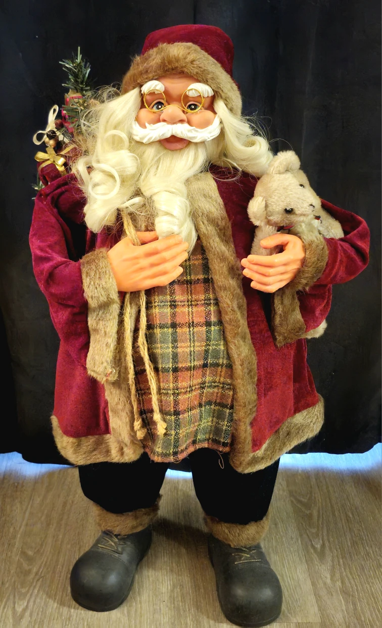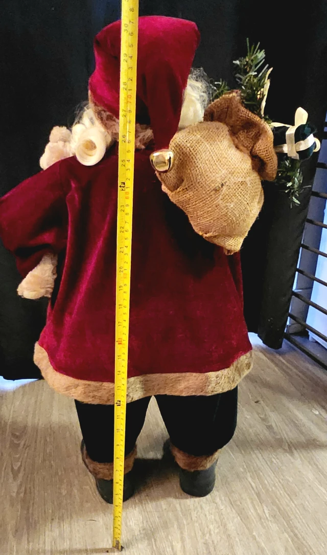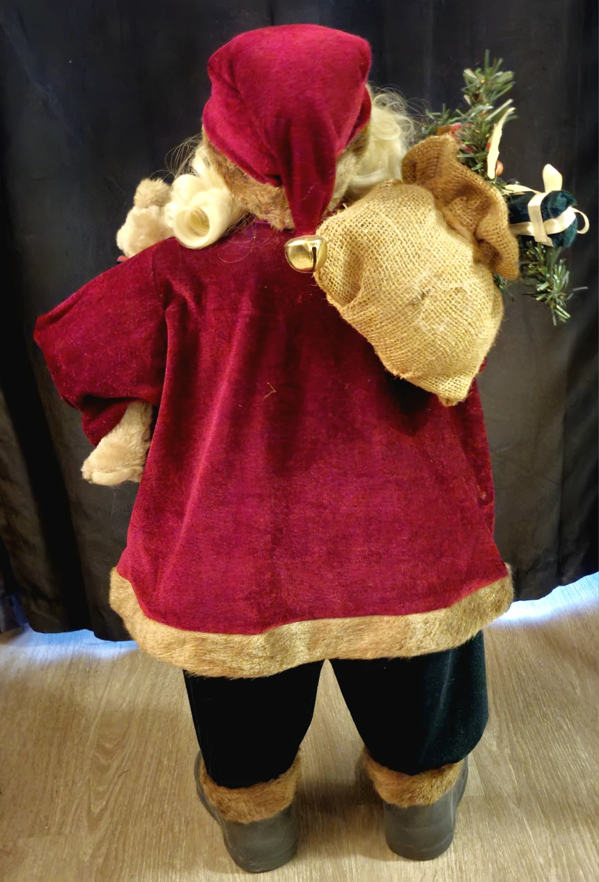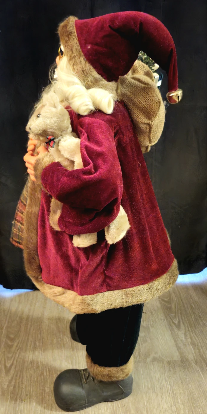 This festive 30-inch (give or take a inch or 2) Santa doll is ready to spread holiday cheer! Dressed in a plush burgundy coat with faux fur trim and carrying a sack full of presents and a sweet teddy bear, this charming figure is perfect for adding a touch of Christmas magic to any room. This is a used item in great condition.