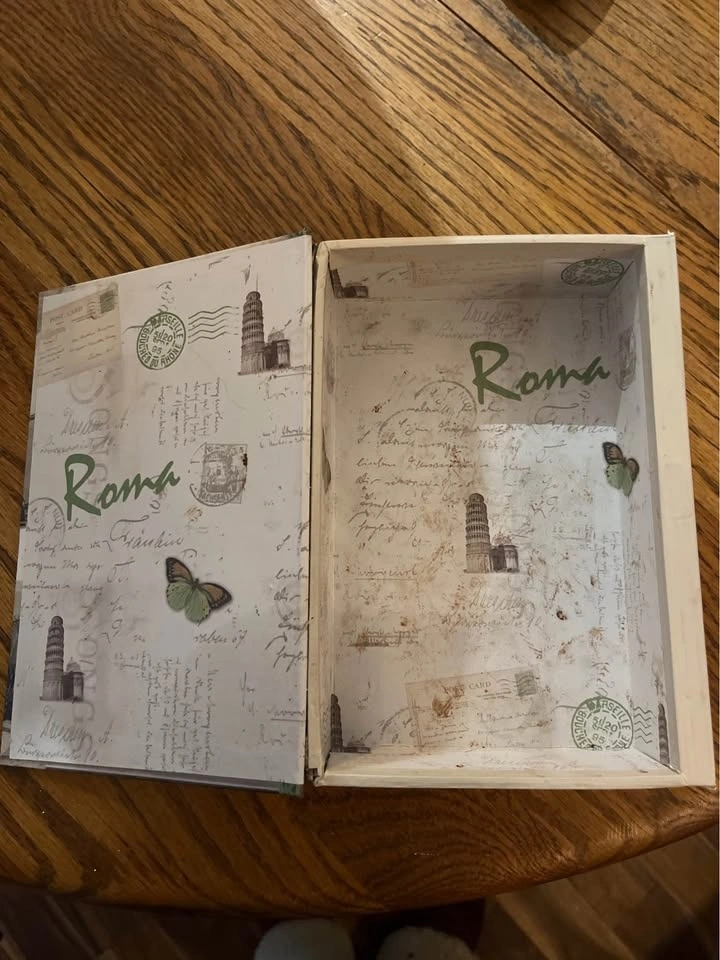 Cute decorative storage box designed to look like a vintage “Roma” book. Features classic Italian landmarks (Leaning Tower of Pisa, Roman Forum) and postcard-style graphics.