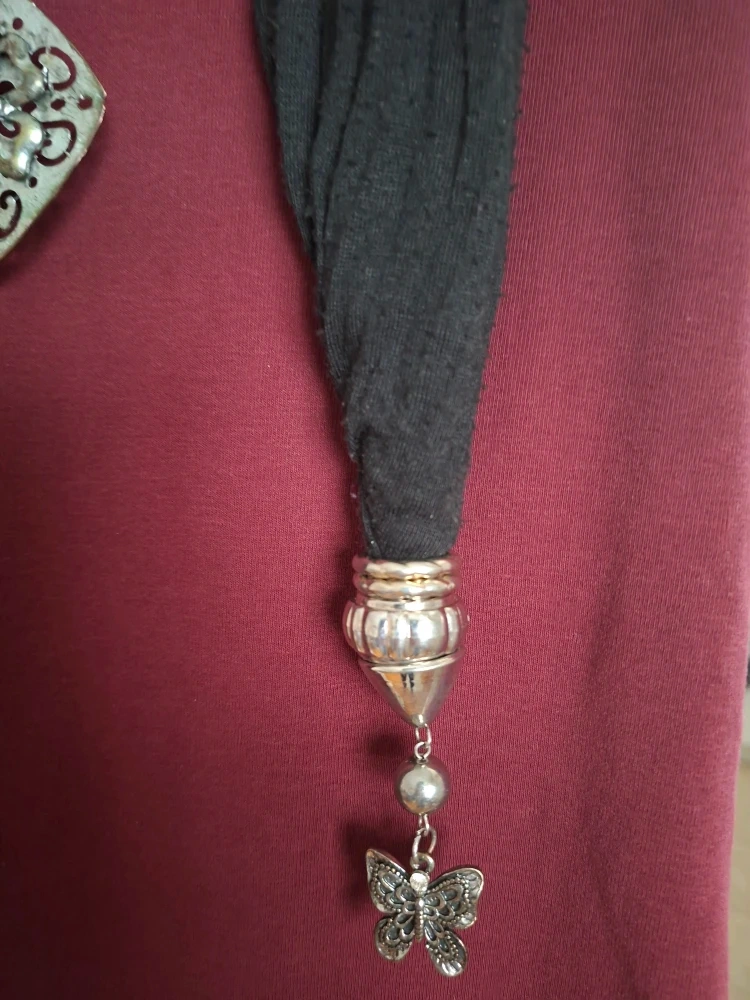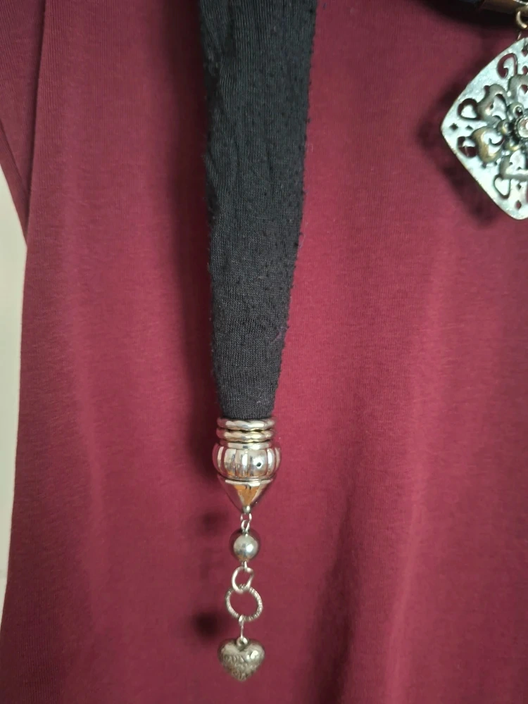 This is a lovely cotton black scarf necklace. It features decorative pendants on each end and a larger pendant in the middle. It's a unique piece that can add a touch of flair to any outfit!