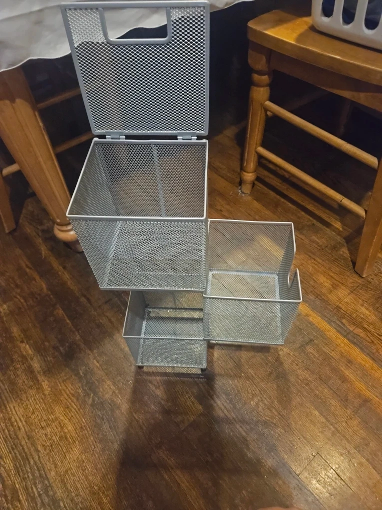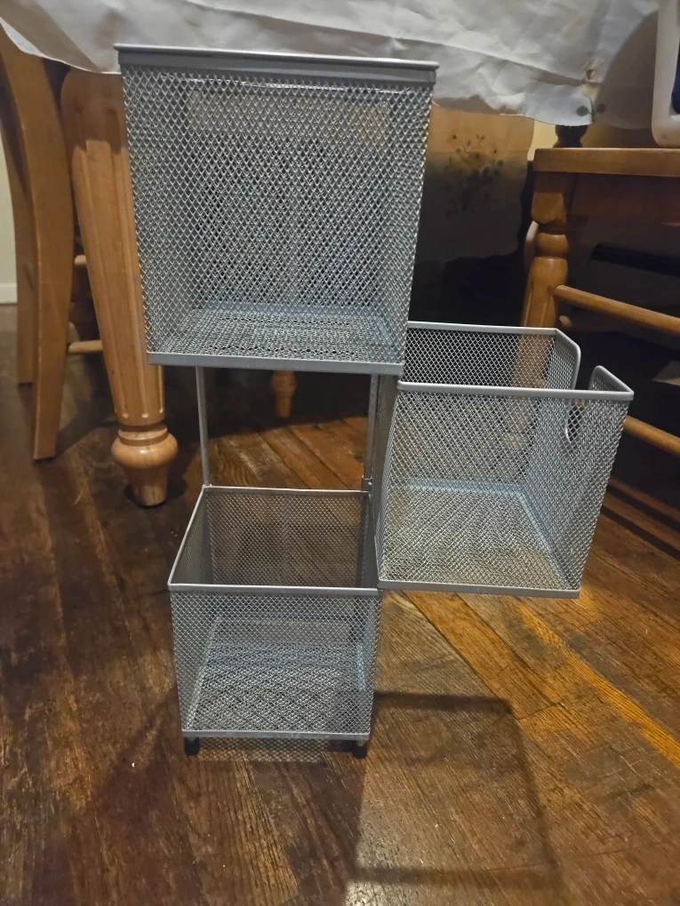 Grey rack for holding and storing Art materials. 20 inches tall and each basket is 6 inches tall. Middle basket can rotate so you can access inside.