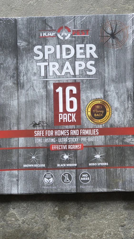 I'm selling a brand new, unopened pack of Trap-A-Pest Spider Traps. This pack includes 16 traps that are safe for homes and families. They're long-lasting, ultra sticky, and pre-baited. Effective against brown recluse, black widow, and hobo spiders. Non-toxic, poison-free, and no mess!